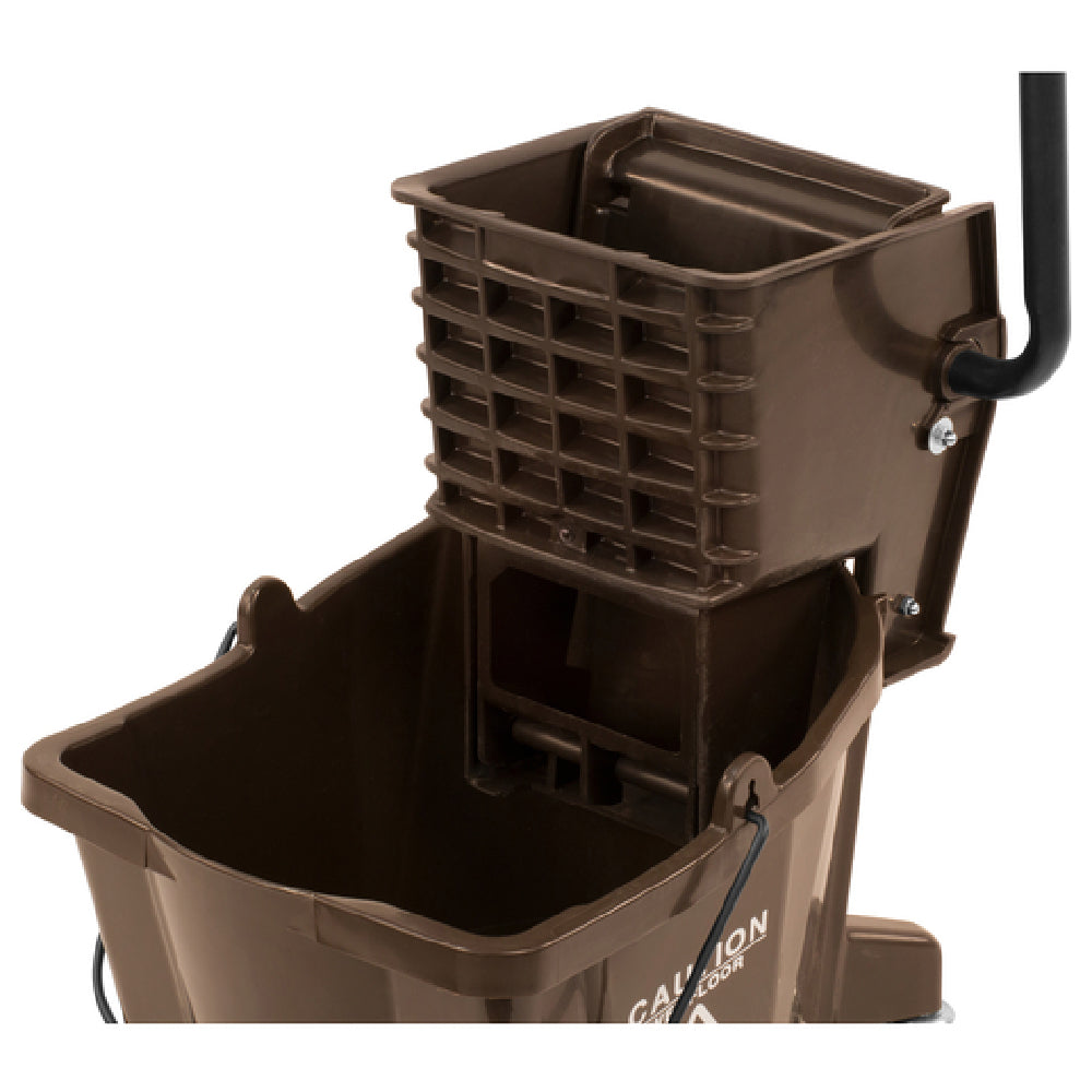 The Carlisle 3690869 Carlisle Mop Bucket Combo 26 Qt. With Side Press Wringer is an essential tool for maintaining cleanliness and efficiency in various professional environments. This mop bucket combo is distinguished by its 26-quart capacity, allowing for ample solution storage that enables cleaning tasks to be completed with fewer interruptions for refilling. Constructed from durable polyethylene, the bucket is designed to withstand the rigors of frequent use while being resistant to corrosion, ensuring long-lasting reliability. A notable feature is its side press wringer, which efficiently extracts water from mops to optimize cleaning effectiveness and reduce user fatigue. Additionally, the mop bucket is equipped with non-marking casters that facilitate smooth and scratch-free mobility across different floor surfaces, preserving the integrity of your workspace. Available in a brown color, this mop bucket combo is part of the Cash n' Carry range, emphasizing immediate availability and practicality for businesses seeking quick and effective cleaning solutions. This product is particularly valuable for janitorial services, hospitality industries, and healthcare facilities, where maintaining a pristine environment is paramount.