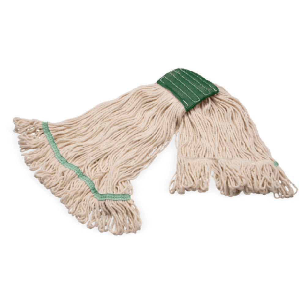 The Carlisle 369120G00 Carlisle Grease Release Wet Mop Head - Medium Looped-end is a versatile cleaning tool designed for durability and efficiency in various cleaning environments. Featuring a medium-sized, looped-end design, this mop head is crafted from natural yarn, ensuring robust performance and longevity for demanding cleaning tasks. The mop head is equipped with a 5-inch wide green band that provides additional stability and support, enhancing the overall durability of the product. This design minimizes fraying and unraveling, common issues with regular mop heads, thus extending its usable life. The Carlisle Grease Release Wet Mop Head is particularly effective in environments where grease and heavy soils are prevalent, making it an ideal choice for industries such as food service, janitorial services, and hospitality. Its capacity to handle tough cleaning jobs with ease positions it as a reliable tool for maintaining high standards of cleanliness across various sectors. Whether used in a bustling restaurant kitchen or a busy hotel, this mop head is engineered to deliver superior cleaning performance, ensuring surfaces are left grease-free and spotless. The focus on quality materials and practical design makes the Carlisle Grease Release Wet Mop Head a valuable asset for professionals seeking dependable cleaning solutions.