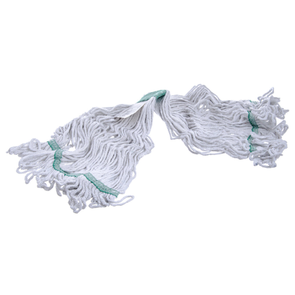 The Carlisle 369419B00 Carlisle Flo-Pac® Wet Mop Head Medium 4 Ply is an innovative cleaning solution designed for efficiency and durability. This medium-sized mop head is crafted from a unique white synthetic/cotton blend yarn, ensuring both high absorbency and resilience. Its 4-ply construction enhances its durability, making it suitable for rigorous cleaning tasks across various surfaces. The looped-end design minimizes tangling and linting, providing a consistent cleaning performance and reducing the frequency of mop replacements. One of the standout features is its washability, allowing for repeated use without compromising its structural integrity. Unlike some alternatives, it is non-pre-shrunk, maintaining its original size and shape after washing. The mop head is further reinforced with a green 1-1/4”W textured polyester band, which adds to its robustness and longevity. This versatile mop head is ideal for commercial cleaning environments such as hospitals, schools, and office buildings, where maintaining cleanliness and sanitation is paramount. Its combination of synthetic and cotton materials provides a balance of strength and softness, making it a reliable choice for various industrial and janitorial applications. The Carlisle 369419B00 embodies practicality and endurance, catering to the diverse needs of cleaning professionals.