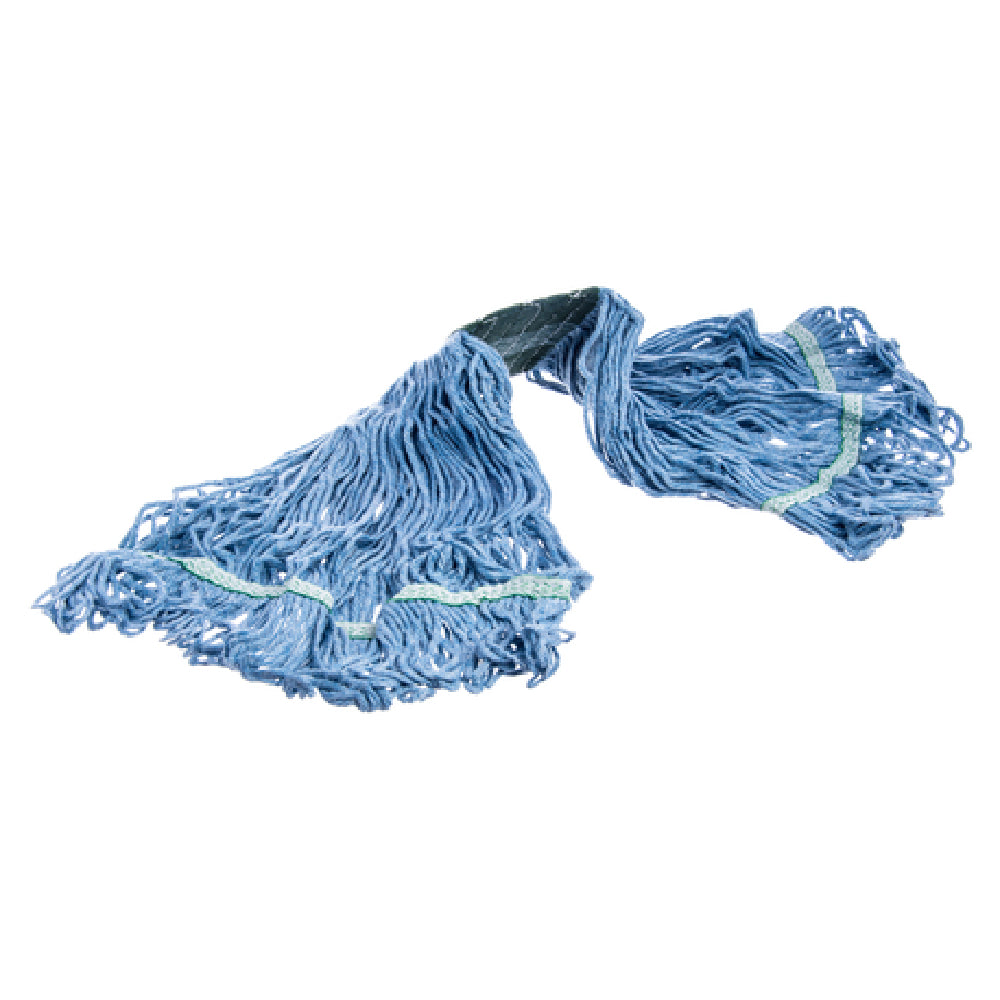 The Carlisle 369448B14 Carlisle Flo-Pac® Wet Mop Head Medium 4 Ply is designed for efficiency and durability in commercial cleaning applications. This mop head features a medium size, making it versatile for various cleaning tasks. It is constructed with a looped-end design to minimize lint and enhance its lifespan. The mop head is washable, allowing for repeated use, which adds to its cost-effectiveness. Made with a non-pre-shrunk, blue synthetic/cotton blend yarn, it combines the absorbency of cotton with the strength and durability of synthetic fibers. The green 5-inch-wide vinyl-coated band offers additional support and durability, ensuring the mop head maintains its shape during rigorous use. This construction makes it suitable for establishments requiring reliable and long-lasting cleaning solutions, such as hospitals, schools, and office buildings. The Carlisle 369448B14 is engineered to provide excellent cleaning performance while being easy to maintain, making it an invaluable tool for janitorial services and facility management teams aiming to achieve high standards of cleanliness and efficiency in their operations. Its thoughtful design underscores its utility across various segments within the cleaning industry.