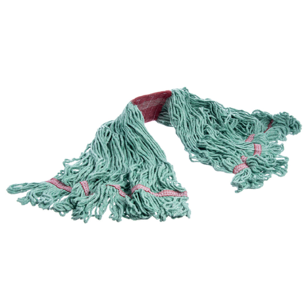 The Carlisle 369484B09 Carlisle Flo-Pac® Wet Mop Head Large 4 Ply is a high-performance cleaning solution designed for various professional environments. This wet mop head features a large size and is constructed with a 4 ply looped-end design, providing enhanced durability and superior cleaning efficiency. The mop head is crafted from a green synthetic/cotton blend yarn, which combines the absorbency of cotton with the strength of synthetic materials, ensuring optimal performance across different surfaces. A key feature of this product is its washable nature, allowing for multiple uses and maintaining cleanliness standards over time. The mop head is non-pre-shrunk, which means it maintains its size and integrity even after frequent washes. A standout element of this product is its red 5-inch wide vinyl-coated band, offering additional durability and aiding in secure attachment to mop handles. This combination of features makes the Carlisle 369484B09 an ideal choice for janitorial services, hospitality, healthcare settings, and other industries requiring reliable and efficient cleaning tools. With its robust construction and thoughtful design, this wet mop head addresses the diverse needs of various market segments, ensuring long-lasting utility and performance.