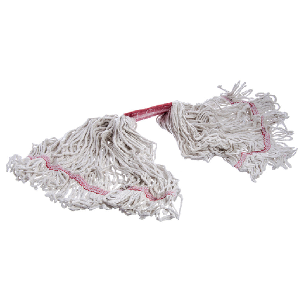 The Carlisle 369552B00 Carlisle Flo-Pac® Wet Mop Head Large 4 Ply is a highly efficient cleaning tool designed for various industrial and commercial environments. This mop head is constructed with a large, 4 ply, looped-end design, ensuring durability and effective cleaning performance. The looped-end feature helps minimize lint and unraveling, enhancing the mop's longevity and effectiveness in high-traffic areas. The mop head is crafted from white cotton yarn, known for its excellent absorbency and ability to handle heavy-duty cleaning tasks. Additionally, the yarn is non-pre-shrunk, allowing it to maintain its size and effectiveness after repeated washings, making it a cost-effective choice for businesses. The inclusion of a red 5-inch wide vinyl-coated band adds to its durability and provides a secure fit to mop handles, ensuring stability during use. This mop head is washable, promoting reusability and sustainability, and making it an ideal choice for facilities management teams seeking efficient and long-lasting cleaning solutions. Its robust construction and practical design make it suitable for sectors such as hospitality, healthcare, and janitorial services, where maintaining cleanliness and hygiene is paramount. The Carlisle Flo-Pac® Wet Mop Head combines quality materials with thoughtful design for a reliable cleaning experience.
