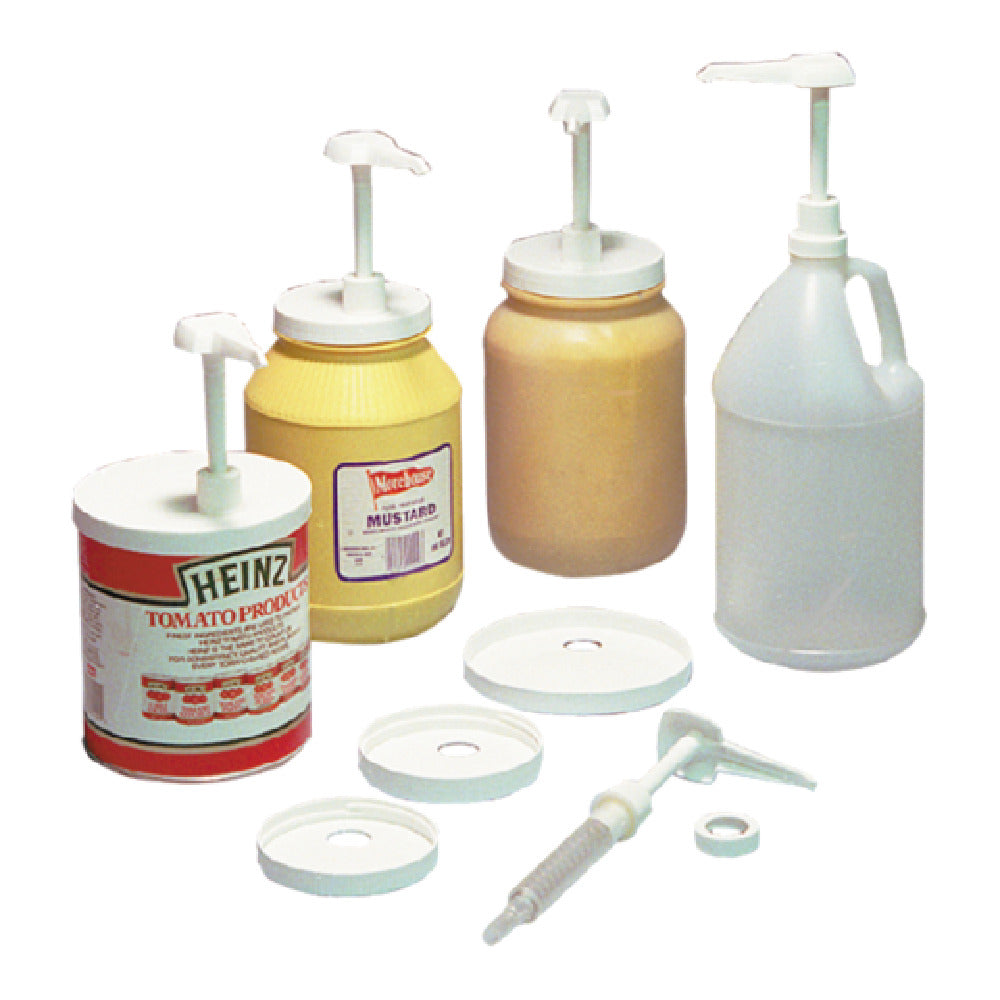 The Carlisle 38310 Carlisle Standard Pump Kit is a versatile solution designed for efficient dispensing needs, featuring a standard pump with a 5" trimmable dip tube. This product is tailored for various market segments requiring precise portion control, such as food service and hospitality industries. The kit includes two restrictor clips, allowing for customizable portion sizes ranging from 1/2 to 1 ounce, ensuring flexibility and precision in liquid dispensing. To cater to different container sizes, it comes with five lids of varying dimensions: 1-1/2", 4-5/16", 4-5/16"SP, 4-11/16", and 6-5/16". These lids are constructed from durable, white plastic, providing reliable performance and compatibility with diverse dispensing environments. The Carlisle Standard Pump Kit's design emphasizes ease of use and adaptability, making it an essential tool for establishments that prioritize efficiency and accuracy in portion control. Its thoughtful construction and range of accessories underscore its utility in maintaining consistent service standards.