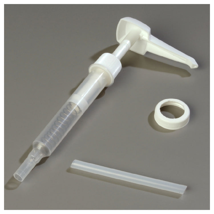 The Carlisle 3831038P Carlisle Condiment Pump & Lid Set is a versatile and efficient tool for food service establishments, designed to dispense condiments conveniently and precisely. This set includes a standard pump capable of delivering either 1/2 oz. or 1 oz. per stroke, providing flexibility depending on the required serving size. It features a 5" dip tube and is equipped with a 1-1/2" (38mm) lid, ensuring compatibility and secure fitting with various containers. Constructed from durable plastic in a clean white finish, this condiment pump and lid set is ideal for a wide range of culinary environments, from fast-food outlets to high-end restaurants, where consistency and hygiene are paramount. Its straightforward design allows for easy cleaning and maintenance, crucial for maintaining food safety standards while reducing downtime in busy kitchen operations. The Carlisle 3831038P set enhances service efficiency by allowing staff to dispense condiments quickly and accurately, catering to diverse customer preferences and ensuring satisfaction. This product's robust construction and adaptable dispensing capabilities make it an essential addition to any food service operation looking to optimize their condiment management system.