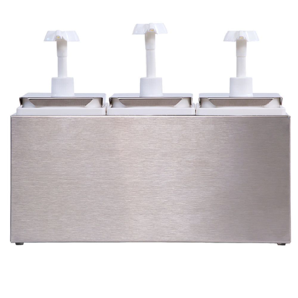 The Carlisle 38503 Carlisle Topping Rail Dispenser is a meticulously designed triple-unit countertop system, measuring 14-7/16 inches in length, 7-3/4 inches in width, and 12-1/2 inches in height. This dispenser is crafted from durable 18/8 stainless steel, ensuring its longevity and resistance to corrosion. It features three standard pumps, each paired with removable 2-1/2 quart jars, allowing for efficient and versatile dispensing of various toppings. The dispenser is equipped with two restrictor clips, accommodating precise portion control with 1/2 and 1 ounce options, making it an ideal choice for businesses that prioritize consistency in their serving sizes. The non-slip rubber footing provides stability and security on any countertop, reducing the risk of spills or accidents during use. This product is particularly beneficial for food service establishments such as ice cream parlors, fast food restaurants, and salad bars, where quick, efficient, and precise dispensing is crucial. Its compact design and efficient functionality make it a highly valuable tool in any setting, ensuring that toppings are served seamlessly and consistently, thus enhancing customer satisfaction and operational efficiency.