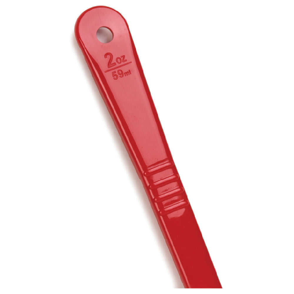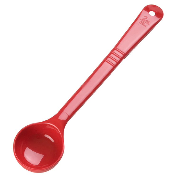 The Carlisle 396005 Carlisle Measure Misers - Portion Spoon 2 Oz. Solid is a precision-engineered tool tailored for efficient portion control in various culinary settings. This red portion spoon features a 2 oz. capacity, making it perfect for accurately measuring and serving ingredients. It is crafted from acetal, a material renowned for its break-resistant properties, ensuring durability even in demanding kitchen environments. The design includes a long handle equipped with a thumb grip, which enhances control and ease of use. A flat bottom design facilitates smooth scooping and ensures the spoon can rest securely without tipping over, thanks to its resting notch. This portion spoon is capable of withstanding dry heat up to 270°F, making it versatile for use with a wide range of food temperatures. Additionally, it is dishwasher safe, simplifying the cleaning process and maintaining hygiene standards. The Carlisle 396005 is BPA-free and NSF certified, ensuring it meets stringent safety and quality standards. This makes it a valuable tool for professional kitchens, catering services, and institutional dining setups, where precision and reliability in portioning are crucial. Its thoughtful design and robust construction make it an indispensable accessory for food service professionals.