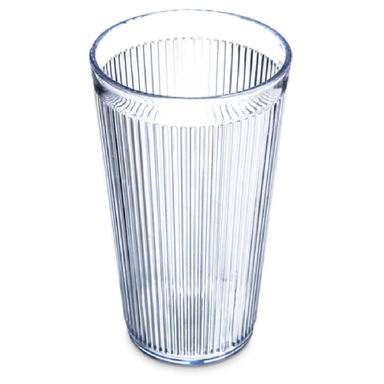 The Carlisle 401607 Carlisle Crystalon® Stack-All® Tumbler 16 Oz. (16.50 Oz. Flush Fill) is a distinctively designed beverage container tailored for practical use across various segments in the hospitality and food service industry. This tumbler boasts a ribbed texture, enhancing grip and aesthetics, and is constructed from SAN, a material known for its durability. Its stackable feature allows for efficient space utilization, making it ideal for venues with limited storage. With a capacity of 16 ounces and a flush fill of 16.50 ounces, it caters to diverse serving requirements. The tumbler is dishwasher safe, ensuring easy maintenance, and is resistant to stains, breakage, and chipping, thus offering longevity in high-traffic environments. Operating effectively within a usable temperature range of 0°F to 180°F, it is suited for various beverage types. Being BPA free and recyclable, it aligns with eco-friendly practices, appealing to environmentally conscious businesses. Packed by 48 each per case, it provides a practical bulk solution for large-scale operations. The clear design of this tumbler complements any table setting, from casual dining to formal events, while prioritizing functionality without compromising on style.