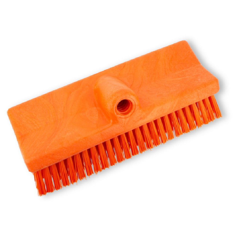 The Carlisle 40423EC24 Carlisle Sparta® Dual Surface Floor Scrub Brush Head Only is a specialized cleaning tool designed for efficiency and durability in various industrial and commercial cleaning environments. This scrub brush head features a compact 10-inch long plastic block that provides stability and easy handling during use. The unique split shape of the brush is engineered to enhance its cleaning capability by allowing it to tackle floors from multiple angles, effectively reaching into corners and other hard-to-clean areas. Equipped with a threaded handle hole, it offers versatility by accommodating different handle types to suit user preference and task requirements. The brush head's bristles are crafted from crimped polyester, known for their strength and resilience, ensuring long-lasting performance even under rigorous cleaning conditions. The bright orange color not only enhances visibility but also adds a touch of vibrancy to your cleaning equipment. Additionally, the brush is BPA-free, underscoring its safety for use in environments where human health and safety regulations are prioritized. The Carlisle Sparta® Dual Surface Floor Scrub Brush Head Only is an ideal choice for professionals seeking a reliable and efficient tool for maintaining cleanliness in diverse settings, from warehouses to commercial kitchens.