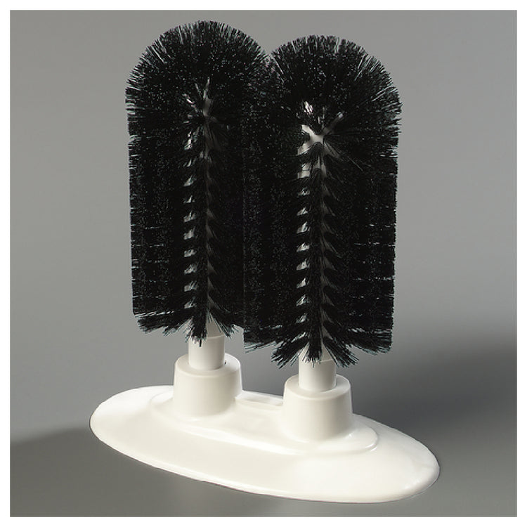 The Carlisle 4046003 Carlisle Sparta® Twin Glass Washer is an expertly designed tool tailored for efficient glass cleaning in busy commercial settings. With a length of 8 inches, this tool features two round twin heads each measuring 6 inches in length and 2-7/8 inches in diameter, making it ideal for accommodating a variety of glass sizes. The washer incorporates heavy-duty stapleset polyester bristles which are known for their durability and effective cleaning performance, ensuring a thorough clean with every use. Its innovative design includes threaded stems on a molded white plastic base, enhancing its stability and ease of use. The base is equipped with positive suction, providing secure attachment to surfaces for safe and efficient operation. The product comes in a sleek black color and is BPA free, emphasizing user safety and eco-friendliness. This glass washer is particularly valuable for restaurants, bars, and cafes where speed and cleanliness are paramount. Its robust construction and thoughtful features make it a vital accessory for maintaining high standards of cleanliness and hygiene in the food service industry.