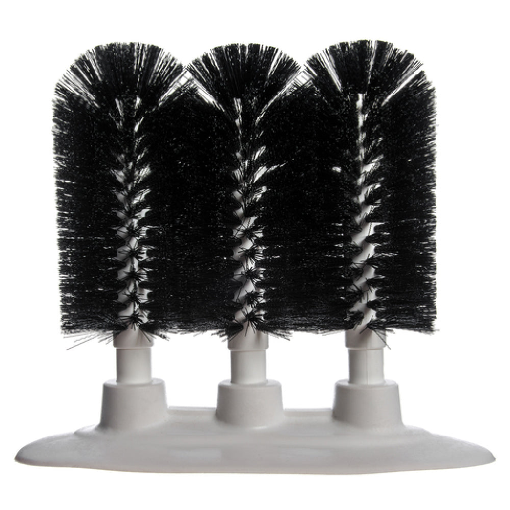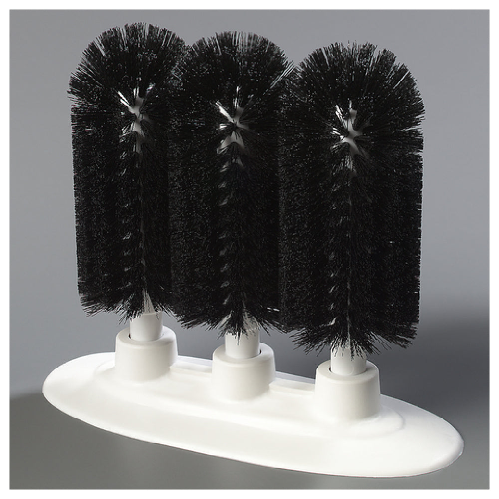 The Carlisle 4046103 Carlisle Sparta® Triple Glass Washer is a precision-engineered cleaning tool designed for efficiency and durability in high-demand environments. Measuring 8 inches in length with a 6-inch long and 2-7/8-inch diameter round triple head configuration, this glass washer is tailored for thorough, multi-angle cleaning action. The heavy-duty stapleset polyester bristles are resilient, ensuring consistent performance over extended use, ideal for both commercial and residential settings. The product integrates a threaded stem on a molded white plastic base, enhancing its sturdiness and ease of assembly. This innovative design includes a positive suction component, offering secure grip and stability during operation. Available in a sleek black finish, the glass washer is BPA-free, aligning with safety and health standards. This makes it particularly appealing for restaurants, bars, and home kitchens where safety and hygiene are paramount. The Carlisle Sparta® Triple Glass Washer is distinguished by its robust construction and versatile application, catering to different market segments that require reliable and effective glass cleaning solutions. Its thoughtful design and premium materials position it as a dependable choice for those seeking a high-quality glass washing apparatus.
