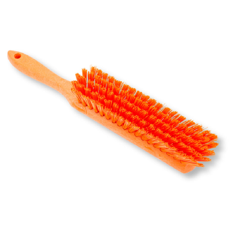The Carlisle 40480EC24 Carlisle Sparta® Counter/Bench Brush 13-1/2"L Overall is a versatile cleaning tool designed for various industrial applications. Featuring an overall length of 13-1/2 inches, this brush is perfectly suited for efficiently tackling cleaning tasks in both residential and commercial environments. It comes with 8-inch long by 1-3/4-inch wide medium polyester bristles, offering durability and effective sweeping action. The bristles are non-absorbent, ensuring they remain resistant to moisture and maintain their performance over time. The brush's design includes a convenient 5-inch plastic handle that provides a comfortable grip during use, and a practical hanging hole for easy storage. Available in a vibrant orange color, this bench brush not only enhances visibility but also adds a touch of color to your cleaning kit. This product is crafted to meet the needs of different market segments, from janitorial services to food service environments, emphasizing its adaptability and reliability in maintaining cleanliness and hygiene. The Carlisle 40480EC24 is a trademark product of CFS Brands, representing quality and innovation in cleaning solutions.