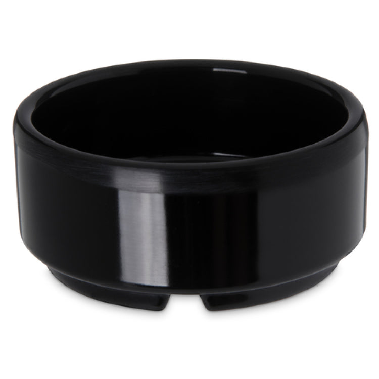 The Carlisle 41003 Carlisle Ramekin 2 Oz. 2-7/8" Dia. is a versatile serving solution designed for various culinary settings, offering a balance of practicality and durability. This ramekin has a volume of 2 ounces, making it perfect for serving small portions of sauces, dips, or desserts. Its dimensions include a 2-7/8 inch diameter and a straight-sided profile with a footed base for stability. Constructed from melamine, this ramekin is both durable and lightweight, ensuring long-lasting use in fast-paced environments. The black color adds a sophisticated touch, suitable for various presentation styles. The ramekin is stackable, optimizing storage space in busy kitchens. It is dishwasher safe, facilitating easy cleaning and maintenance, and can withstand temperatures up to 212°F, making it ideal for both hot and cold applications. Certified by NSF, this ramekin meets strict public health and safety standards. Additionally, it is BPA-free, ensuring it is safe for contact with food. The Carlisle 41003 ramekin is a reliable choice for restaurants, catering services, and hospitality venues, providing a practical and stylish solution for serving a variety of dishes.
