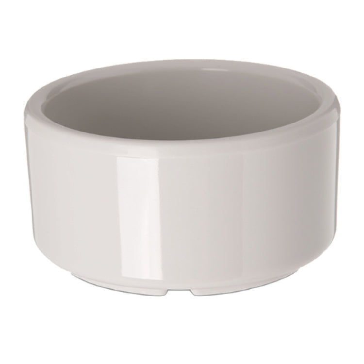 The Carlisle 41242 Carlisle Ramekin 3 Oz. 3" Dia. is a versatile solution designed for both commercial kitchens and home dining environments. With a capacity of 3 ounces and a diameter of 3 inches, this ramekin is ideal for serving individual portions of sauces, dips, or desserts. Its straight-sided, footed design enhances stability and presentation on any table setting. Constructed from durable melamine material, it withstands temperatures up to 212°F, making it suitable for a range of culinary applications. This ramekin is dishwasher safe, ensuring effortless cleaning and maintenance, while its stackable feature allows for efficient storage, saving valuable kitchen space. The product's bone color provides a neutral backdrop that complements various tableware styles. Additionally, the Carlisle ramekin is NSF certified and BPA free, underscoring its commitment to safety and quality standards. This makes it an excellent choice for restaurants, catering services, and food service venues seeking reliable and stylish serving options. Its practical design and robust construction cater to the demands of busy kitchens, offering both functionality and aesthetic appeal to different segment markets within the food service industry.