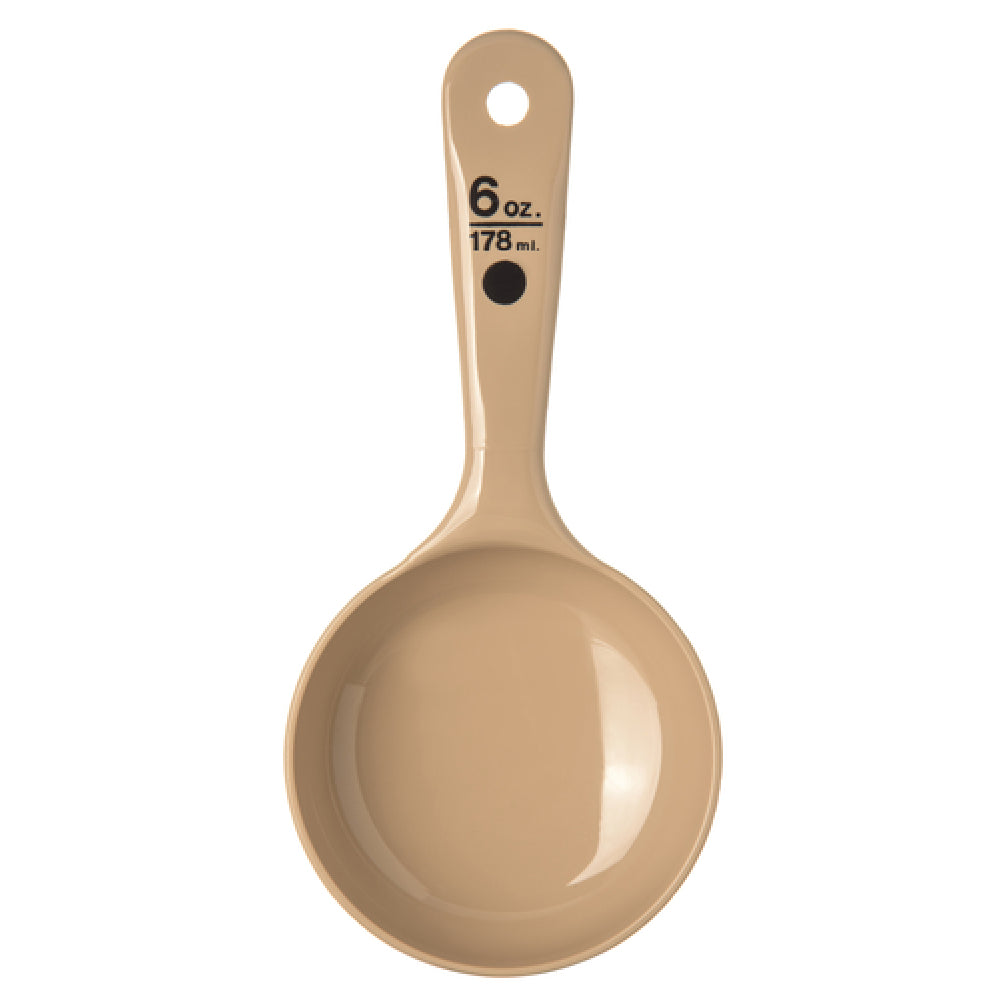 The Carlisle 433006 Carlisle Measure Misers® Portion Server 6 Oz. Solid is a precision tool designed for efficient food portioning, making it an excellent choice for commercial kitchens and catering services. This portion server features a solid construction with a capacity of 6 ounces, ensuring accurate serving sizes for consistency across various culinary applications. Its short handle design enhances control and ease of use, ideal for fast-paced food service environments. Crafted from durable polycarbonate material, this portion server is both lightweight and resistant to impact, offering long-lasting performance. The product's beige color allows for easy identification in busy kitchen settings. It is dishwasher safe, simplifying cleaning procedures and maintaining high hygiene standards. Certified by NSF, the portion server meets rigorous health and safety requirements, making it suitable for professional food establishments. Proudly made in the USA, the Carlisle Measure Misers® Portion Server combines quality and functionality, catering to the needs of restaurants, cafeterias, and catering businesses seeking reliable portion control solutions.
