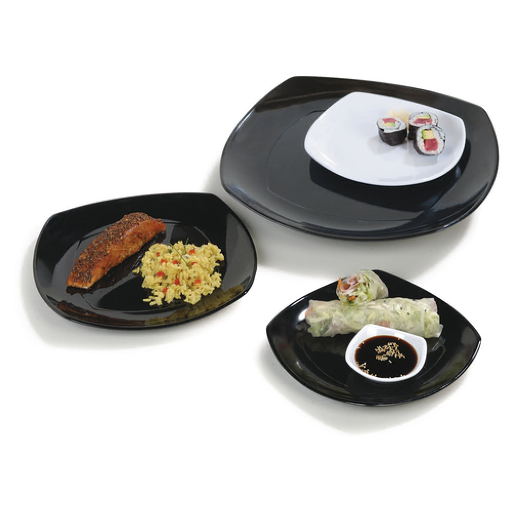 The Carlisle 4330803 Dinner Plate is a meticulously designed square dinnerware piece measuring 7-3/4" x 7-3/4", perfect for various food service environments. Its upturn corners and rolled edge provide a modern aesthetic, while the reinforced rim and foot ensure durability and longevity. The dinner plate is constructed from melamine, a material known for its exceptional resistance to stains, chips, and breaks. This makes it an ideal choice for busy restaurants, cafeterias, and catering services. The plate is dishwasher safe, offering convenience and efficiency in cleaning. It can safely withstand temperatures up to 212°F, ensuring compatibility with various food types without drawing heat or cold from the meal, thereby maintaining the integrity and flavor of the food served. As a stackable item, it saves valuable storage space, contributing to organized kitchen operations. Additionally, the Carlisle dinner plate is BPA-free and NSF certified, meeting the highest standards of safety and reliability in food service applications. Its sleek black finish adds a touch of sophistication, making it versatile enough to complement any table setting while providing unmatched practical benefits for different segment markets in the culinary industry.