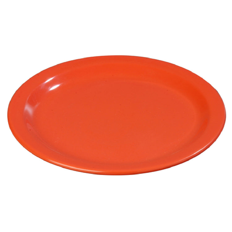 The Carlisle 4350152 Carlisle Dallas Ware® Dinner Plate 9" Dia. is a meticulously designed piece, measuring 9 inches in diameter and featuring a reinforced rim and foot for added durability. This plate is crafted from melamine, a material known for its robust nature, making it ideal for commercial food service environments. The plate's construction ensures that it resists drawing heat or cold away from food, maintaining optimal serving temperatures. Its stackable design allows for efficient storage, a crucial factor for busy kitchens where space is at a premium. Further enhancing its practicality, this dinner plate is dishwasher safe, offering convenience in high-volume settings. Available in a vibrant sunset orange color, the plate adds a touch of modern aesthetic to any dining setup. It is also BPA Free, ensuring safety for all users and compliance with health standards, as certified by the NSF. The Carlisle 4350152 is an excellent choice for restaurants, catering services, and institutional dining facilities that demand both functionality and style. Its combination of strength, safety, and visual appeal makes it a versatile addition to any tableware collection, catering to a wide range of market segments within the food service industry.