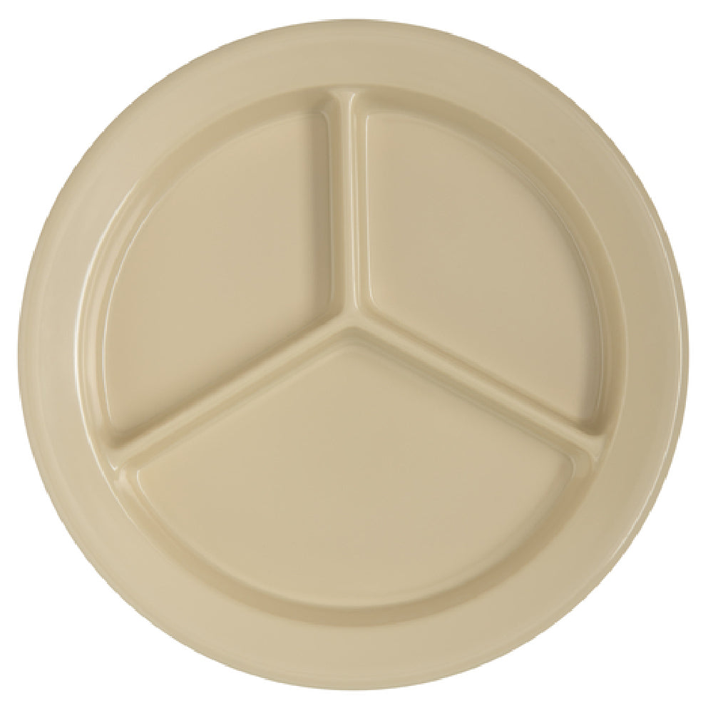 The Carlisle 4351625 Carlisle Dallas Ware® Compartment Plate - 9" Dia. with 3 Compartments is a meticulously designed dining solution adept for diverse settings ranging from institutional cafeterias to restaurants requiring durability and practicality. Crafted from high-quality melamine, this plate boasts a reinforced rim and foot, ensuring robustness and longevity in high-traffic environments. Its 9-inch diameter features three separate compartments, allowing for efficient portion control and food presentation. This compartmentalized design is particularly beneficial in settings where meal segregation is essential, such as in healthcare or educational facilities. The plate is designed to resist drawing heat or cold away from food, maintaining optimal food temperature for extended periods. Notably, it is dishwasher safe, facilitating ease of cleaning and maintenance in busy kitchen operations. The stackable nature of the plate ensures space-efficient storage, making it a convenient choice for kitchens with limited space. Being BPA free and NSF certified, it adheres to high standards of safety and quality, making it suitable for various professional food service environments. With its tan color, the plate seamlessly blends with a wide array of dining themes while ensuring the reliability and functionality that professionals demand.