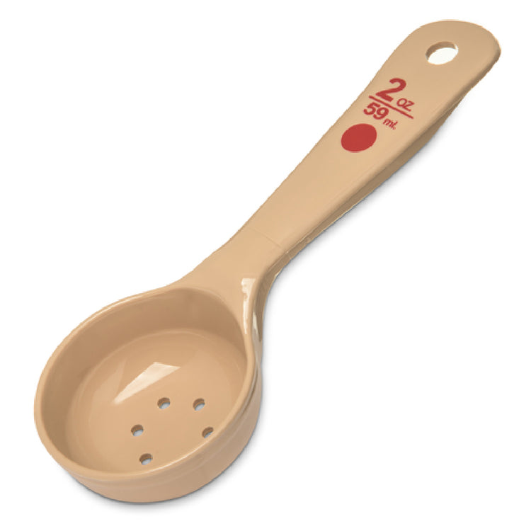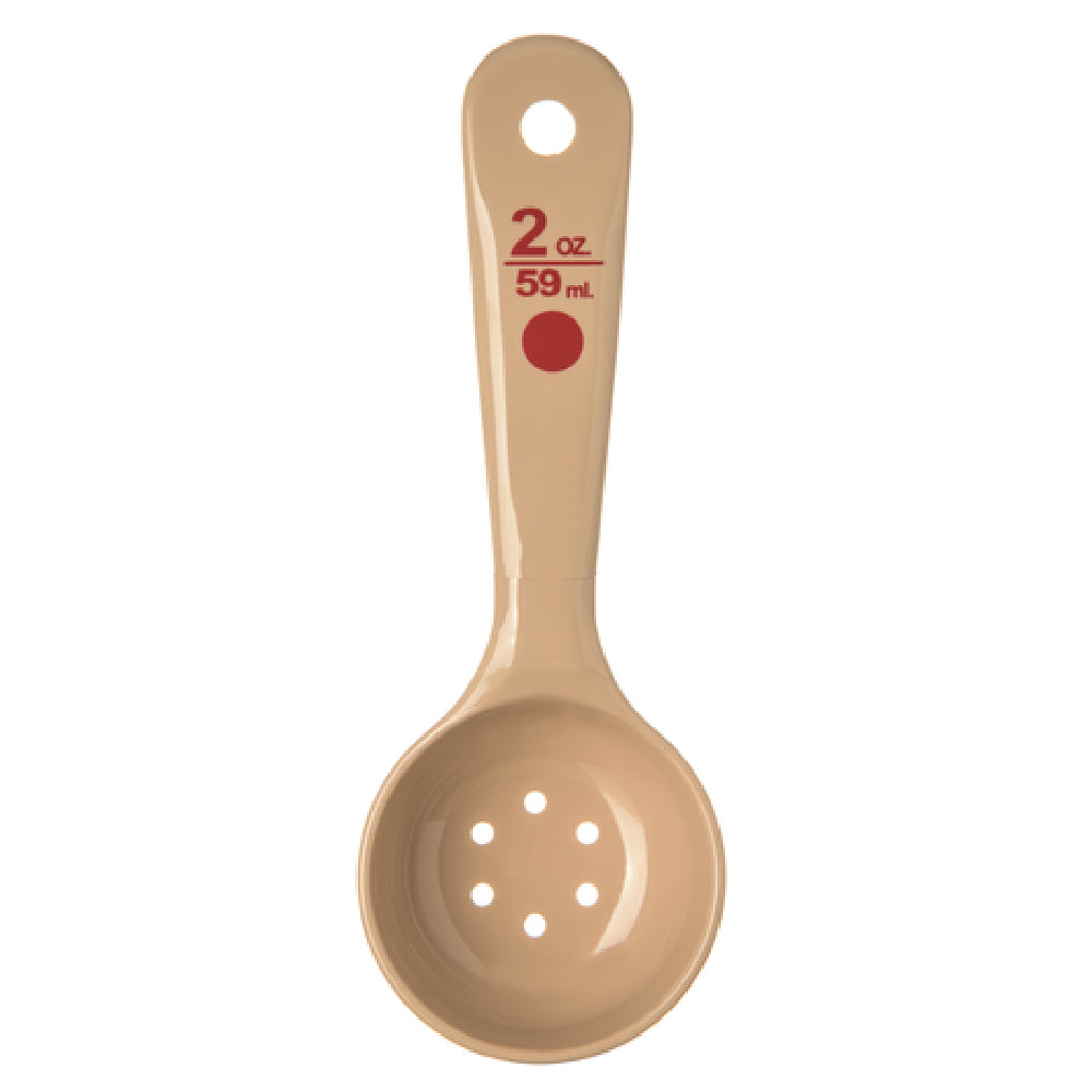 The Carlisle 436206 Carlisle Measure Miser® 2 Oz. Perforated is a versatile kitchen tool designed for precise portion control, ideal for both commercial and home kitchens. This measuring tool features a 2-ounce capacity and is equipped with a perforated design that allows for easy draining of liquids, making it perfect for serving sauces, dressings, or broths. It boasts a 7-1/8" handle that ensures a comfortable grip and efficient reach in deep containers. The flat bottom design ensures stability when placing it down between uses. Constructed from break-resistant materials, this product is highly durable and suitable for frequent use in busy kitchen environments. It is BPA Free, ensuring that it is safe for contact with food products. The beige color of the Measure Miser® adds a neutral, professional look to any kitchen setting. Additionally, it is NSF certified, which attests to its compliance with standards for public health and safety. This product is an excellent choice for those in the food service industry looking for precision and reliability in portion control tools.