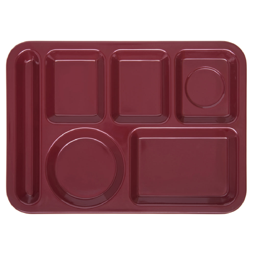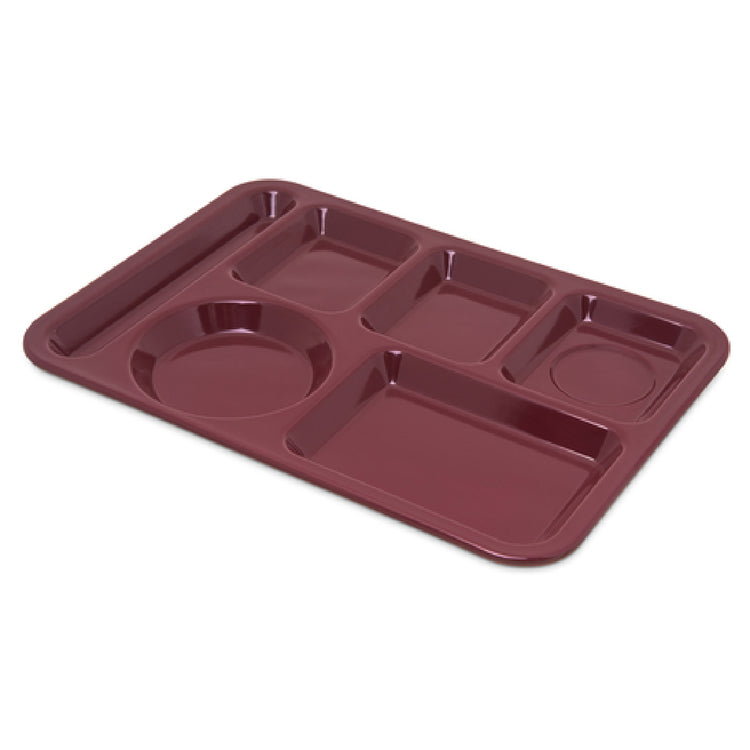 The Carlisle 4398085 Carlisle Compartment Tray 14"L X 10"W Left-handed is a meticulously designed rectangular tray ideal for various dining environments. It features a unique configuration with six compartments - three small upper compartments, two large lower compartments, and one dedicated flatware compartment, offering organized meal arrangements. Engineered for durability, this tray is stain, scratch, and break resistant, ensuring longevity in high-traffic settings such as cafeterias and healthcare facilities. The tray is crafted from melamine, a material known for its robustness and ease of maintenance. Its dark cranberry color not only adds a touch of elegance but also conceals signs of wear over time. Measuring 14 inches in length and 10 inches in width, the tray is specifically designed for left-handed users, reflecting thoughtful inclusivity in its design. This product is dishwasher safe, promoting efficient cleaning and sanitation processes in compliance with industry standards. Additionally, it holds the NSF certification, affirming its adherence to public health and safety regulations. The Carlisle 4398085 tray is particularly valuable to educational institutions, healthcare facilities, and any food service operations seeking reliable, user-friendly, and aesthetically pleasing dining solutions.