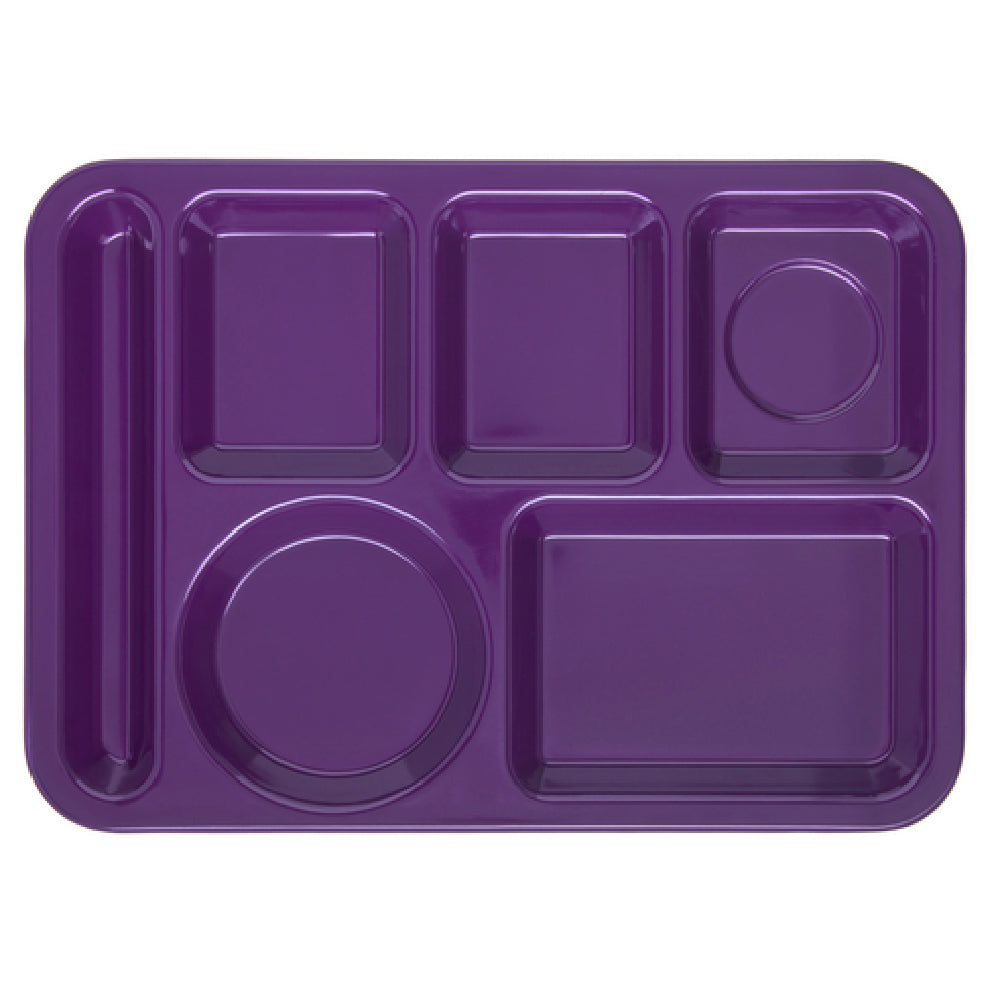 The Carlisle 4398087 Carlisle Compartment Tray 14"L X 10"W Left-handed is a meticulously designed tray, ideal for various settings such as schools, cafeterias, and healthcare facilities where organization and durability are paramount. This rectangular tray measures 14 inches in length and 10 inches in width, optimized for left-handed users. It features a total of six compartments - three small upper compartments, two large lower compartments, and one designated for flatware, facilitating efficient and organized meal service. Crafted from high-quality melamine, the tray is stain, scratch, and break resistant, ensuring longevity and resilience in high-use environments. The vibrant purple color adds a touch of aesthetic appeal, making it suitable for diverse dining settings. As a dishwasher-safe product, it allows for easy cleaning, maintaining high standards of hygiene with minimal effort. Furthermore, being NSF certified, this tray adheres to strict public health and safety guidelines, enhancing its reliability and trustworthiness in professional food service operations. The Carlisle 4398087 tray not only meets functional needs but also provides a practical solution tailored for left-handed individuals, offering an ergonomic and efficient dining experience.
