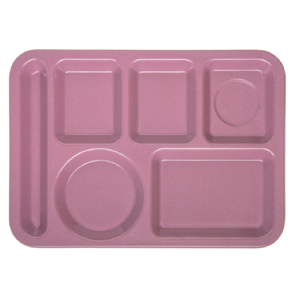 The Carlisle 4398193 Carlisle Compartment Tray 14"L X 10"W Left-handed is a meticulously designed rectangular tray, perfect for various dining and organizational needs. This left-handed model measures 14 inches in length and 10 inches in width, offering ample space for meal components. It features six compartments - detailed as three small upper compartments, two large lower compartments, and one specifically for flatware - allowing for efficient and convenient food service operations. Crafted from durable melamine, this tray is stain, scratch, and break-resistant, ensuring longevity and repeated use in high-traffic settings such as cafeterias, schools, or hospitals. Its Rose Granite® finish not only adds a touch of elegance but also supports its robust construction. Dishwasher safe, the tray offers easy maintenance and quick turnover. Additionally, it carries NSF certification, emphasizing its compliance with health and safety standards, making it a reliable choice for institutions prioritizing hygiene and quality. The Carlisle Compartment Tray stands out as a versatile and practical solution for establishments seeking durable and organized serving options tailored for left-handed users.