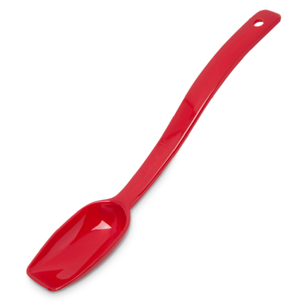 The Carlisle 446005 Carlisle Salad/Buffet Spoon is a versatile utensil designed for both salad preparation and buffet service, combining practicality with durability. With a capacity of 1/2 oz. and a length of 9 inches, this solid spoon is engineered to provide precision in portion control, making it suitable for catering events and restaurant settings where consistent serving sizes are crucial. Constructed from robust plastic, it is capable of withstanding temperatures up to 212°F and dry heat up to 270°F, making it ideal for both hot and cold food applications. Its notched handle enhances grip and control, ensuring ease of use for serving professionals. This spoon is also dishwasher safe, facilitating easy cleaning and maintenance in fast-paced food service environments. The vibrant red color not only adds a touch of style but also aids in quick identification among kitchen tools. NSF certification guarantees that it meets high standards for health and safety, making it a reliable choice for commercial kitchens. Proudly made in the USA, the Carlisle 446005 Salad/Buffet Spoon is a valuable tool for food service operations, offering a blend of functionality and compliance with industry standards.