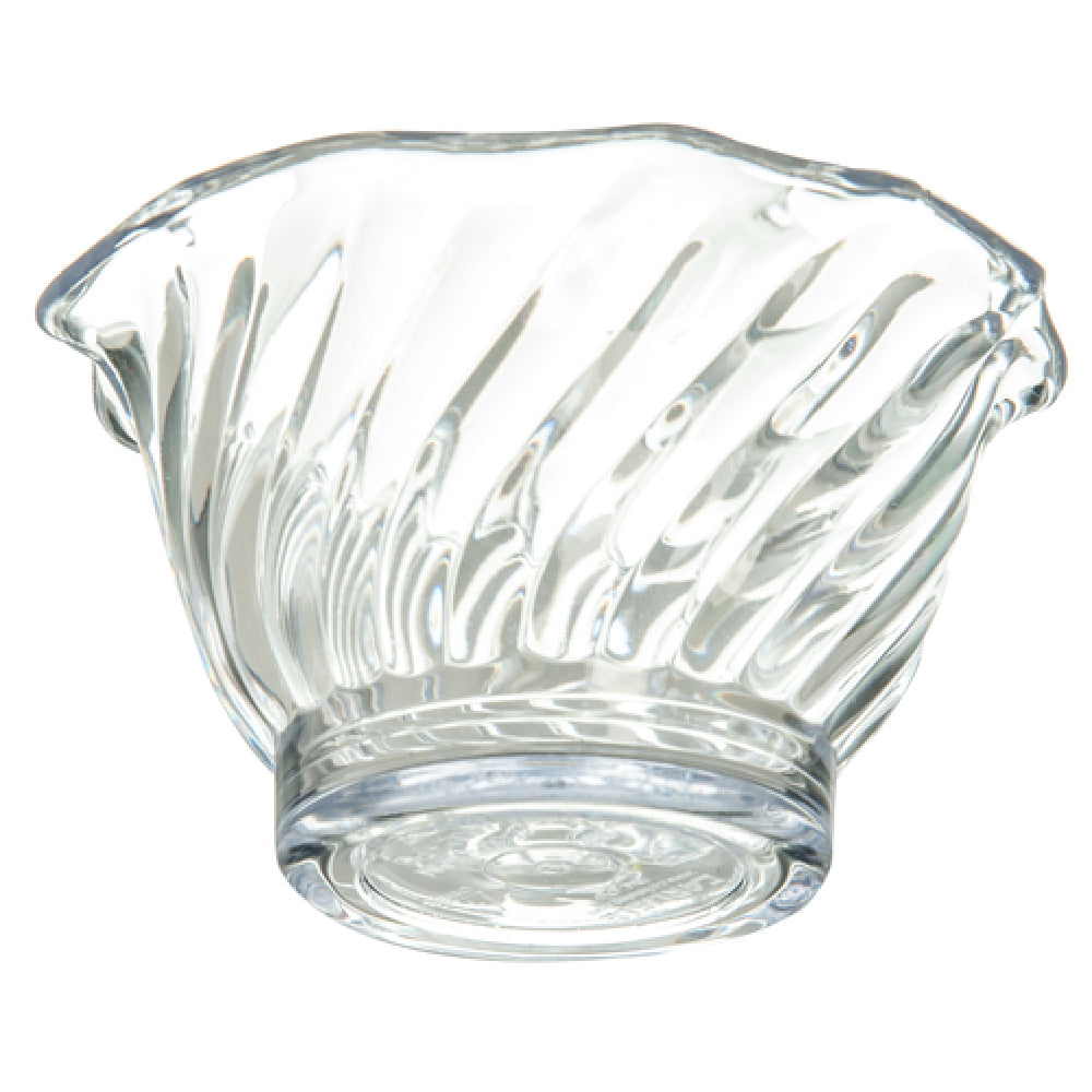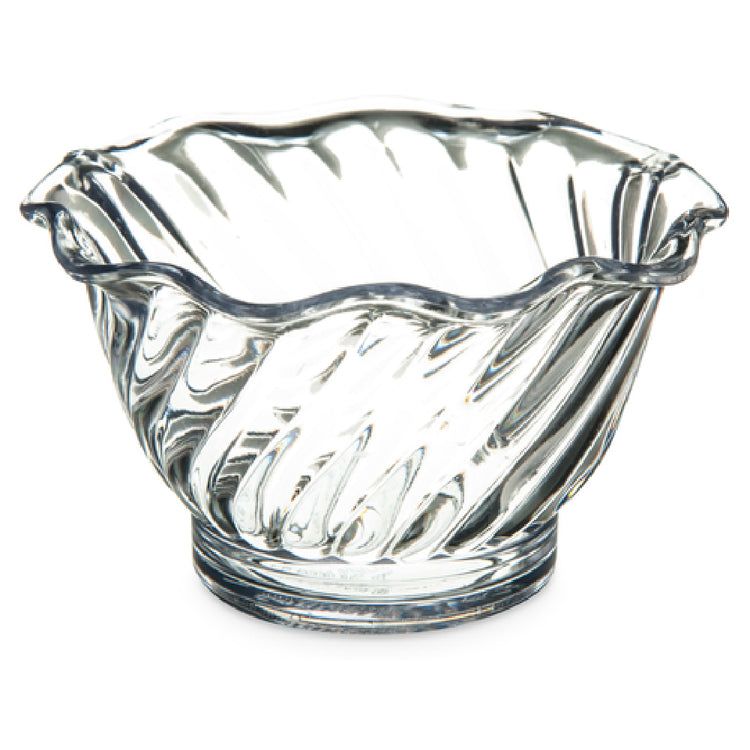 The Carlisle 453007 Carlisle Tulip Dessert Dish 5 Oz. 3-3/4" Dia. is a meticulously designed piece that blends functionality with elegance, making it a staple for any food service establishment. With a 5 oz. capacity and a precise 3-3/4" diameter, this dish is perfectly suited for serving a variety of desserts. Its unique scalloped edge not only enhances its aesthetic appeal but also adds a touch of sophistication to any presentation. Crafted from durable SAN material, this dish is engineered to be stain, chip, and break resistant, ensuring longevity and reliability in high-traffic environments. The dish is dishwasher safe, simplifying the cleaning process and enhancing operational efficiency. Its stackable design allows for convenient storage, making it an excellent choice for establishments with limited space. Additionally, being recyclable reflects a commitment to environmental responsibility. Certified by NSF, this dish meets rigorous public health standards, ensuring safety and quality. Proudly made in the USA, the Carlisle Tulip Dessert Dish offers a clear, pristine appearance that highlights the vibrancy of any dessert. This versatile dish is ideal for restaurants, caterers, and dessert shops looking to elevate their dining experience with quality and style.