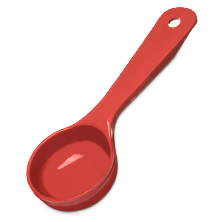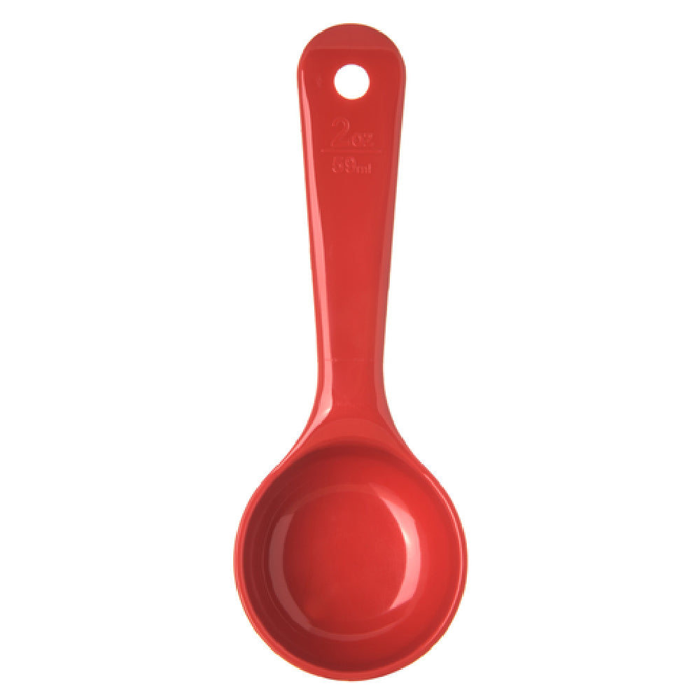 The Carlisle 492405 Carlisle Measure Misers® Portion Spoon 2 Oz. Solid is a meticulously designed tool, ideal for various foodservice environments requiring precise portion control. This spoon is constructed from acetal, a material known for its durability and resistance to breakage, ensuring longevity in busy kitchens. With a solid, flat-bottomed design, it offers reliable performance in measuring and serving applications. The spoon's short handle provides ease of use and control, especially in confined spaces or when working with hot surfaces. It is dry heat-resistant up to 270°F, making it suitable for high-temperature settings without risk of deformation. Furthermore, the portion spoon is dishwasher safe, facilitating easy cleaning and maintaining hygiene standards. The vibrant red color aids in quick visual identification, reducing the chance of cross-contamination. As an NSF certified and BPA-free product, it meets stringent safety and quality regulations, ensuring peace of mind for users. This portion spoon is an excellent choice for commercial kitchens, cafeterias, and catering services where precise serving sizes and durability are paramount, offering a reliable solution to meet the demands of fast-paced food preparation environments.