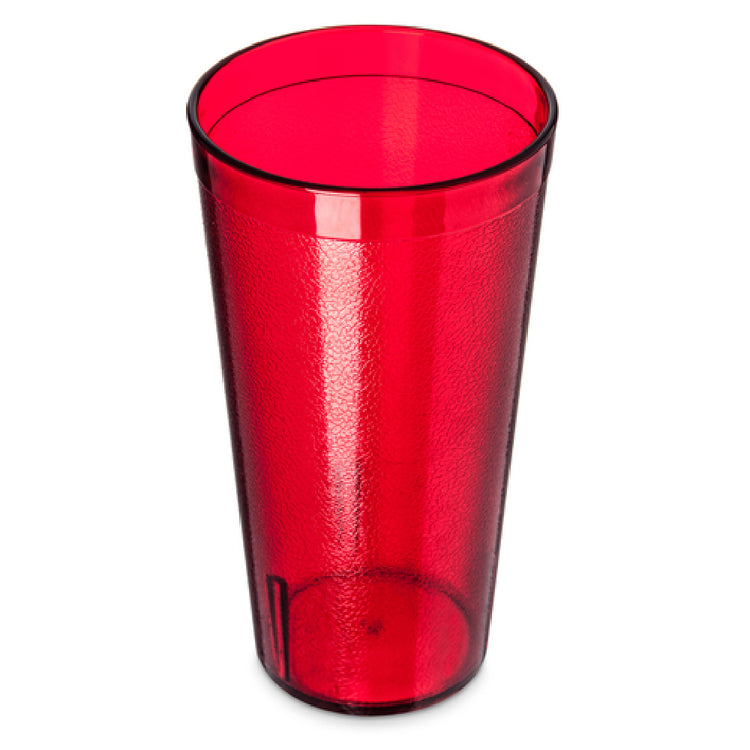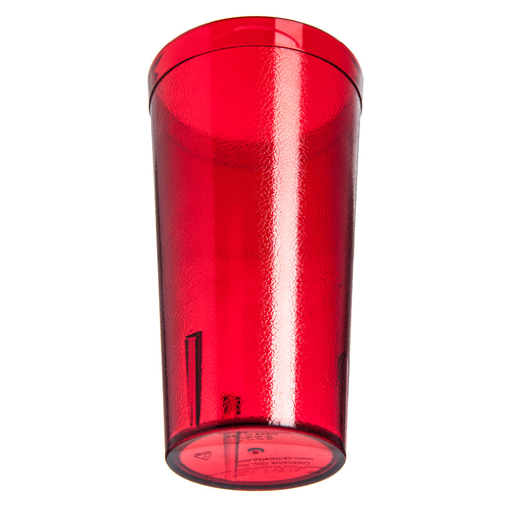 The Carlisle 522010 Carlisle Stackable™ Tumbler 20 Oz. (22.30 Oz. Flush Fill) is a versatile drinkware solution designed for various environments, including restaurants, cafeterias, and catering services. With a capacity of 20 ounces and a flush fill volume of 22.30 ounces, this tumbler offers practicality and style. Its tapered design ensures ease of stacking, optimizing storage space and enhancing efficiency in fast-paced settings. The textured exterior not only provides an elegant appearance but also ensures a secure grip, minimizing the risk of spills. Made from stain, break, and chip-resistant SAN plastic, this tumbler is built to withstand the demands of high-traffic environments while maintaining its aesthetic appeal. As a dishwasher-safe and recyclable product, it supports eco-friendly initiatives and simplifies maintenance routines. Available in a striking ruby color, the tumbler is BPA-free and NSF-certified, assuring users of its safety and compliance with health standards. Proudly manufactured in the USA, the Carlisle 522010 tumbler embodies durability and quality, making it a preferred choice for establishments focused on delivering reliable service and maintaining sustainability standards. Its innovative design and robust construction cater to the functional and aesthetic needs of diverse market segments within the hospitality industry.