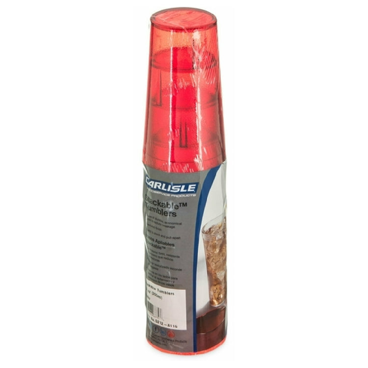 The Carlisle 5232-8210 Carlisle Stackable™ Tall Tumbler 32 Oz. (34.90 Oz. Flush Fill) is a versatile and durable drinking solution, perfect for various sectors in the food and beverage industry. Engineered with a tapered design, this tumbler offers a capacity of 32 ounces and can accommodate up to 34.90 ounces when filled to the brim. Its textured exterior not only enhances grip but also resists stains, breaks, and chips, ensuring longevity and reliability. Constructed from SAN plastic, this tumbler is both BPA-free and recyclable, aligning with health and environmental standards. Its dishwasher-safe nature simplifies cleaning processes for busy establishments. Designed for practicality, these tumblers are stackable, optimizing storage space without compromising on accessibility. Available in a striking ruby color, the tumbler adds aesthetic appeal to its functionality. Certified by NSF, it adheres to strict safety and quality benchmarks, and being made in the USA enhances its credibility. Delivered in packs of six and shrink-wrapped for secure handling, the product requires a minimum order of four packs, making it a pragmatic choice for restaurants, cafes, and catering services that demand both style and substance in their drinkware solutions.