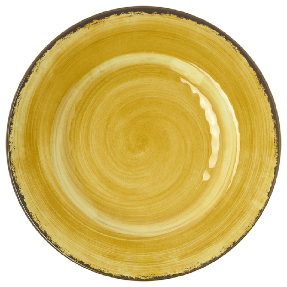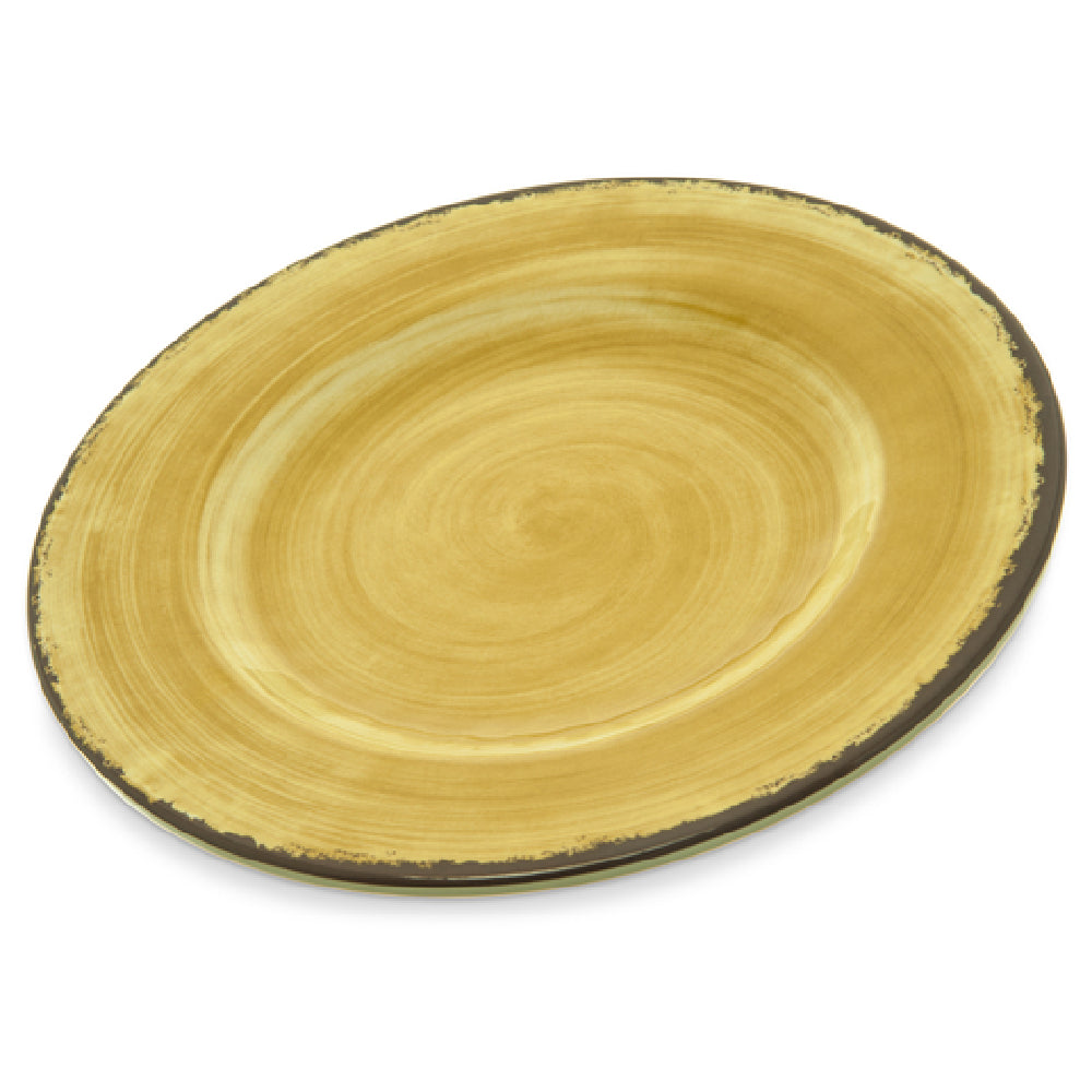 The Carlisle 5400213 Carlisle Mingle™ Salad Plate - 9" Dia. Round is a meticulously crafted dish designed for versatile use across various dining segments. With a 9-inch diameter and round shape, it features an elegant swirl design that enhances its visual appeal. This plate is constructed from melamine, a durable material known for its ability to resist staining and chipping, ensuring longevity even in demanding settings. The reinforced rim and foot design add to its durability while allowing it to be stackable, optimizing storage space in busy kitchens. It is dishwasher safe, making it easy to clean and maintain. The material is BPA Free, ensuring safety for consumers. Additionally, the plate is NSF certified, highlighting its compliance with health and safety standards. A unique feature of this salad plate is its ability to resist drawing heat or cold away from food, maintaining the desired temperature of dishes served. It is safe for use with temperatures up to 212°F, making it suitable for a wide range of culinary applications. The amber color adds a touch of sophistication, making this plate an ideal choice for establishments seeking both functionality and aesthetic appeal in their tableware.