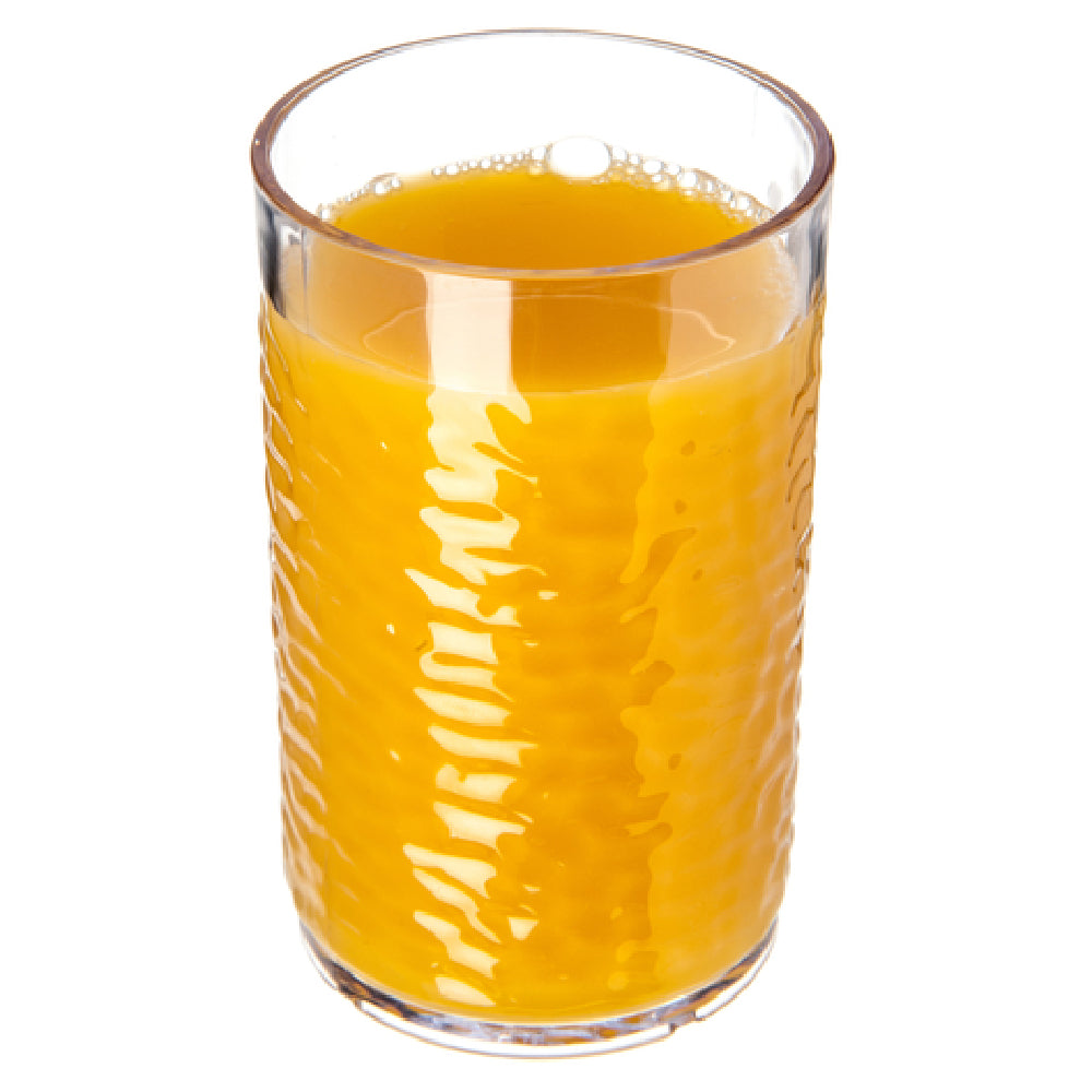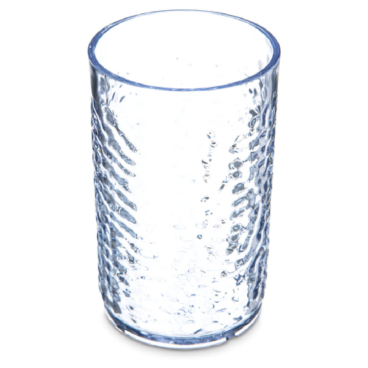 The Carlisle 550907 Carlisle Pebble Optic™ Tumbler 9-1/2 Oz. (10.90 Flush Fill) is a versatile and durable drinkware solution ideal for various commercial and institutional settings. This tumbler is designed with a unique pebbled exterior that offers an enhanced grip and aesthetic appeal. Crafted from SAN (styrene acrylonitrile resin), it boasts exceptional strength, being stain, break, and chip resistant, thereby ensuring longevity even under demanding usage conditions. With a capacity of 9-1/2 ounces and a flush fill of 10.90 ounces, it caters to a range of beverage serving needs. The tumbler is also BPA Free, aligning with health and safety standards. It is stackable, optimizing storage space, which is a significant advantage for busy foodservice environments. Additionally, this tumbler is dishwasher safe, simplifying the cleaning process. It can operate within a temperature range of 0°F to 140°F, making it suitable for various cold and warm beverages. The clear design adds to its versatility, fitting seamlessly into different dining scenarios. Moreover, it is recyclable, supporting environmentally sustainable practices. This product comes packed 24 per case, making it a practical choice for bulk purchasing in cafes, restaurants, and catering services.