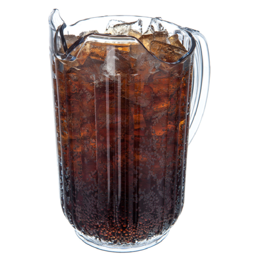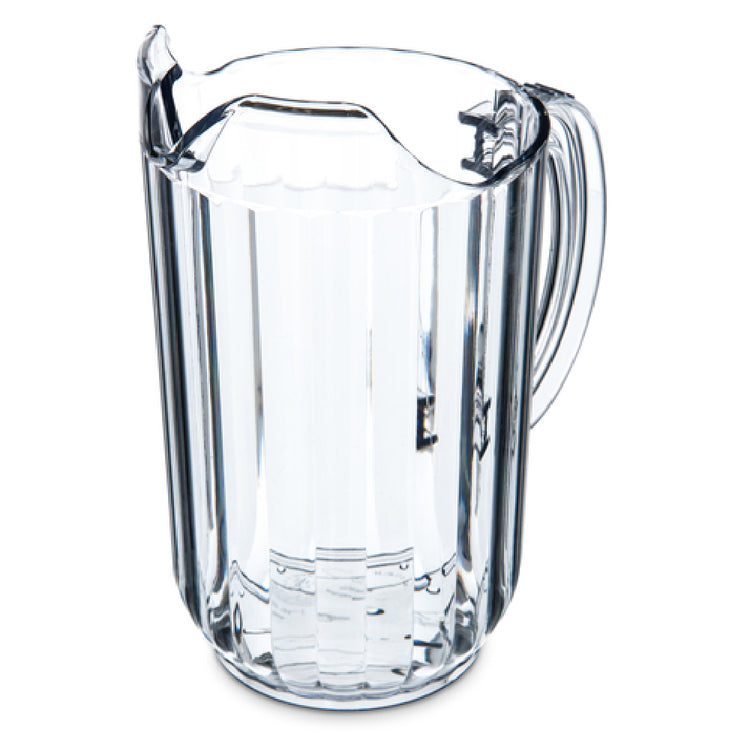 The Carlisle 553807 Carlisle Pitcher 48 Oz.-Fluted Straight Sides is a versatile and durable solution for various beverage serving needs. With its 48-ounce capacity, this pitcher is perfectly suited for both commercial and home use, catering to different segment markets within the food and beverage industry. The pitcher features fluted straight sides, which not only enhance its aesthetic appeal but also provide a secure grip for efficient pouring. Its contoured lip design ensures a smooth and controlled flow, minimizing spills and drips. Made of clear polycarbonate, the pitcher is stain, break, and chip-resistant, providing longevity and consistent performance in high-traffic environments. Being dishwasher safe, it facilitates easy cleaning, making it a practical choice for busy establishments. The recyclable nature of the material aligns with sustainable practices, appealing to environmentally-conscious users. NSF certification guarantees that it meets public health and safety standards, while the Made in USA label underscores its quality and reliability. This Carlisle pitcher is a valuable asset for restaurants, cafes, and catering services that prioritize durability and functionality in their serving equipment.