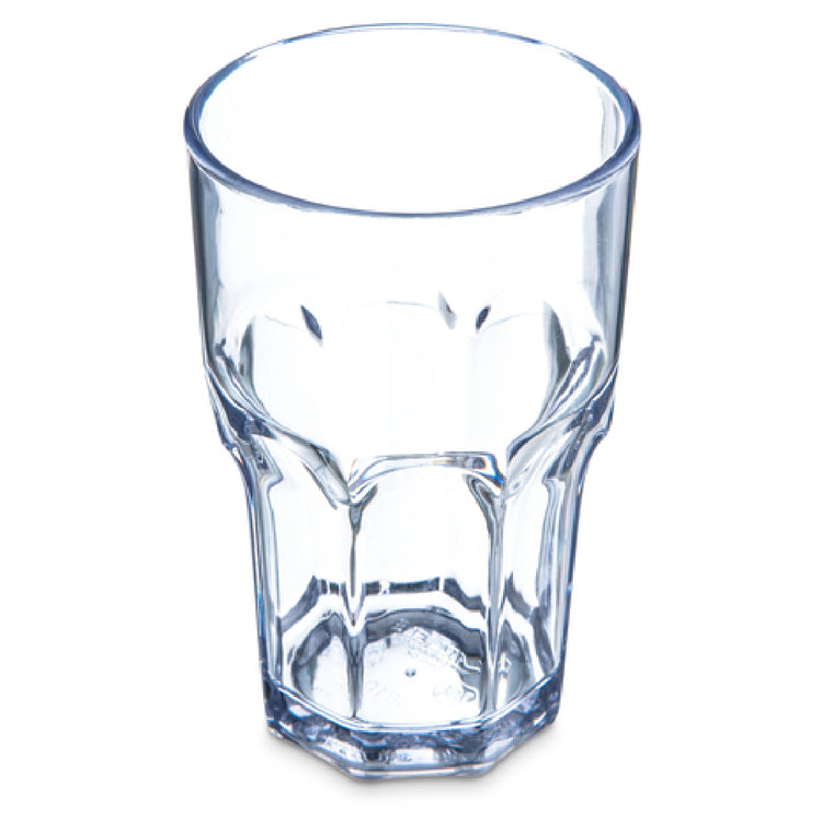 The Carlisle 581007 Carlisle Louis™ Tumbler 10 Oz. (10.40 Oz. Flush Fill) Faceted Shape is a versatile and durable choice for various industry segments, including hospitality, catering, and food service establishments. This tumbler, with its 10-ounce capacity and 10.40-ounce flush fill, is designed to cater to different beverage serving needs. Its faceted shape adds a touch of elegance and improves grip, making it ideal for both casual and formal settings. Made from SAN (styrene acrylonitrile), it is clear, BPA-free, and NSF certified, ensuring safety and compliance with health standards. The tumbler's notable features include its dishwasher-safe design, and its resistance to stains, breaks, and chips, ensuring longevity and easy maintenance. It can withstand temperatures ranging from 0°F to 180°F, making it suitable for a variety of beverages. The stackable nature of the Carlisle Louis™ Tumbler makes it a space-saving solution, particularly advantageous for establishments with limited storage. Additionally, its recyclable material aligns with sustainable practices, appealing to eco-conscious businesses. Packed with 24 tumblers per case, this product is both practical and economical for large-scale operations. The Carlisle 581007 tumbler offers an exceptional balance of function, durability, and style, meeting diverse market demands.