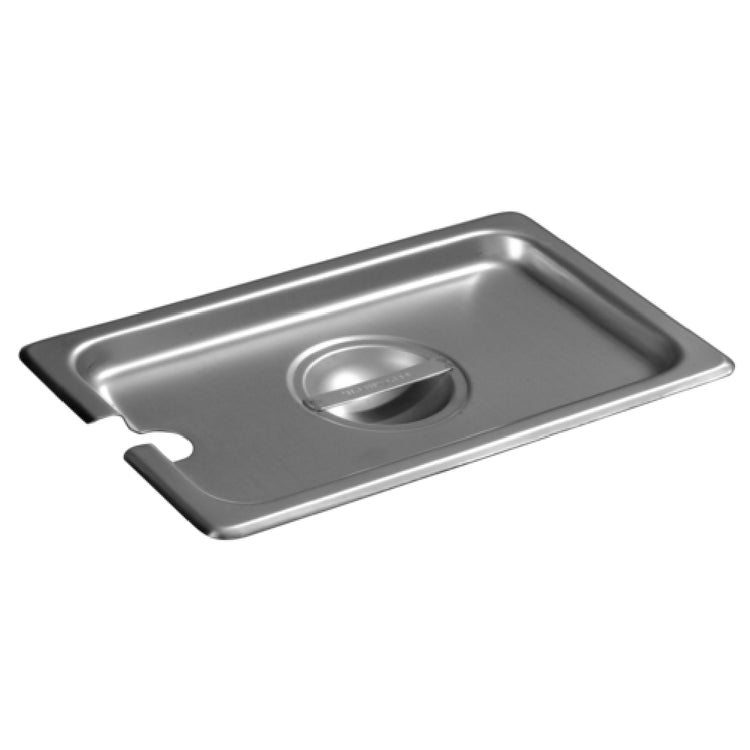 The Carlisle 607140CS Carlisle DuraPan™ Steam Table Pan Cover 1/4 Size Slotted is a meticulously crafted kitchen accessory, designed to enhance efficiency in food service environments. Made from 24 gauge 18/8 stainless steel, this cover ensures durability and resistance to corrosion, making it a reliable choice for long-term use. Its flat, slotted design is specifically tailored for steam table pans, allowing for convenient handling and optimal steam release to maintain food quality. The recessed handle allows for easy lift-off functionality, streamlining operations in busy kitchens. Dishwasher safe, it supports seamless cleaning and maintenance, ensuring hygiene standards are met effortlessly. This pan cover is part of the DuraPan™ line from CFS Brands, known for its superior quality and performance. Ideal for use in catering, buffets, and commercial kitchen settings, this cover addresses the needs of various market segments by providing an efficient solution for food storage and presentation. Its quarter-size dimensions are perfect for smaller volume requirements, making it a versatile tool for chefs and food service professionals aiming to maintain precision in their culinary endeavors.
