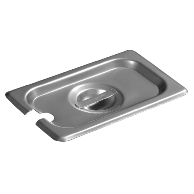 The Carlisle 607190CS Carlisle DuraPan™ Steam Table Pan Cover 1/9-size Slotted is a specialized accessory designed for culinary professionals seeking durability and functionality in their kitchen equipment. Crafted from 24-gauge, 18/8 stainless steel, this slotted steam table pan cover is engineered for resilience and performance. Its 1/9-size dimension makes it a precise fit for compatible steam table pans, ensuring optimal heat retention and moisture control during food service. The flat, lift-off design incorporates a recessed handle, providing ease of use while maintaining a sleek profile. This thoughtful design feature aids in the smooth operation of busy food service environments, allowing for quick access and efficient handling. The cover is dishwasher safe, offering convenience in maintenance and upholding high hygiene standards. This makes it a valuable asset for professional kitchens, catering events, or buffet settings. The inclusion of a slot enhances its practicality by accommodating serving utensils, thereby minimizing heat loss and maintaining food quality. The Carlisle 607190CS is well-suited for diverse segments within the foodservice industry, including restaurants, catering companies, and institutional kitchens, where precise temperature control and efficient service are paramount. Its robust construction and thoughtful features underscore its commitment to quality and user-centric design.