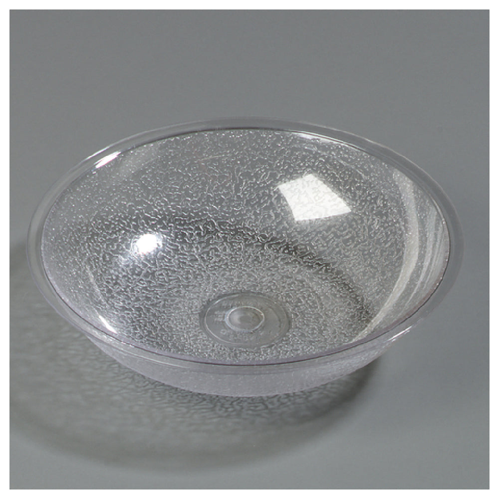 The Carlisle 720607 Carlisle Salad Bowl is a versatile serving solution designed to meet the diverse needs of food service industries. With a capacity of 12 ounces, and 20 ounces when flush filled, this round salad bowl features a 6-inch diameter, making it well-suited for various portion sizes. The bowl is crafted from durable polycarbonate, known for its exceptional strength and clarity. Its pebbled exterior not only enhances grip but also adds an aesthetic appeal while being scratch and stain resistant, ensuring longevity in high-traffic environments. This salad bowl is both freezer and dishwasher safe, offering convenience in preparation and cleanup processes. The clear design allows for easy visibility of contents, making it an ideal choice for showcasing vibrant salads and other dishes. An important reassurance of its quality and safety is its NSF certification, marking the bowl as compliant with public health and safety standards. The Carlisle 720607 Carlisle Salad Bowl is a practical and reliable choice for restaurants, cafeterias, and catering services, providing a combination of durability, ease of use, and professional presentation.