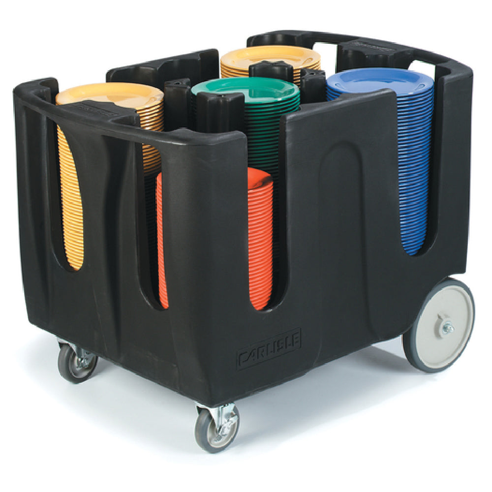 The Carlisle ADD403 Carlisle Optimizer™ Dish Dolly is a versatile and efficient storage solution, measuring 43"L x 28"W x 31-3/4"H, designed with a unique poker chip design. This dish dolly includes four adjustable dividers, allowing for customizable storage and organization, capable of holding five stacks of plates ranging from 9-7/8" to 11-1/4" in diameter. Engineered for ease of use, it features ergonomic rounded handles and two-handle access, ensuring comfortable maneuverability. Its rounded corners add a layer of safety, preventing damage to dishes and surroundings. The dish dolly is equipped with non-marking casters, two of which are locking, providing stability during transport and use. Constructed from durable polyethylene in black, it comes with a vinyl cover for added protection. The NSF certification guarantees that the product meets stringent health and safety standards, making it ideal for use in commercial kitchens, catering events, and other food service environments. With its thoughtful design and robust functionality, the Carlisle ADD403 Carlisle Optimizer™ Dish Dolly delivers reliable performance for businesses seeking efficient and organized dish storage solutions.