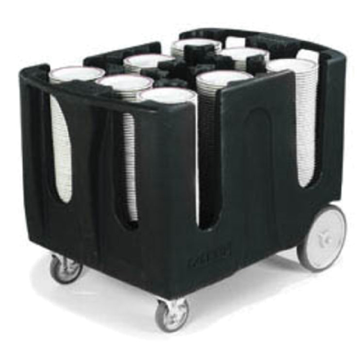 The Carlisle ADD603 Carlisle Optimizer™ Dish Dolly is a meticulously engineered solution for efficiently managing dishware, measuring 43 inches in length, 28 inches in width, and 31-3/4 inches in height. This dish dolly stands out with its innovative poker chip design, which accommodates six stacks of plates ranging from 8-3/8 inches to 9-3/4 inches in diameter. Featuring six adjustable dividers, it allows for customizable storage configurations to suit varying needs. Ergonomically rounded handles provide comfortable and secure access from two sides, enhancing maneuverability. The dolly is equipped with non-marking casters, including two that lock for stability and two that are free-rolling for easy movement. Its robust construction from durable polyethylene ensures longevity and resilience in demanding environments. A vinyl cover is included to protect dishware from dust and contaminants, maintaining hygiene standards. The product's black finish offers a sleek aesthetic, complementing its functional design. NSF certification underscores its compliance with health and safety standards, making it a trusted choice for restaurants, catering services, and institutional kitchens. The Carlisle ADD603 Dish Dolly's thoughtful design and practical features offer an effective solution for organized dishware handling across various industry segments.