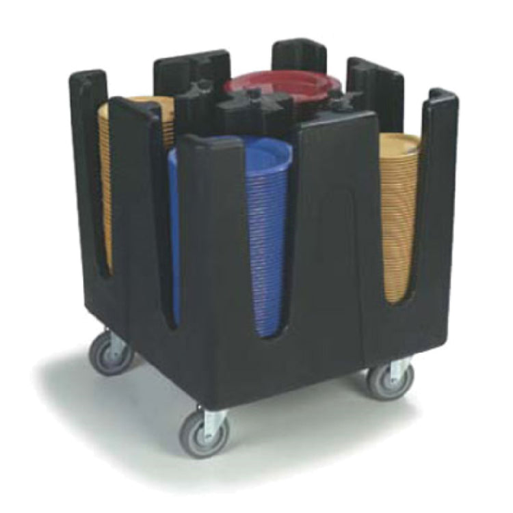 The Carlisle ADS403 Carlisle Optimizer™ Small Dish Dolly is a versatile and efficient solution designed to streamline dish management in various food service environments. Measuring 29 inches in length, 29 inches in width, and 31-3/4 inches in height, this dish dolly offers a compact yet capacious design, ideal for optimizing space in busy kitchens. Its unique poker chip design facilitates organized stacking, ensuring easy access and retrieval. Equipped with four adjustable dividers, the dolly allows for a flexible configuration to accommodate different dish sizes and shapes, catering to diverse operational needs. The inclusion of two-handle access enhances maneuverability, providing ease of transportation within tight spaces. Constructed from durable polyethylene, the dish dolly boasts rounded corners that minimize the risk of damage to walls and fixtures. It features non-marking casters, including two locking and two non-locking, ensuring stability and effortless mobility. This NSF-certified product signifies compliance with rigorous health and safety standards, making it a reliable choice for restaurants, hotels, and catering services. Available in a sleek black finish, the Carlisle ADS403 Carlisle Optimizer™ Small Dish Dolly combines functionality with aesthetic appeal, serving as a practical asset for any professional kitchen setting.