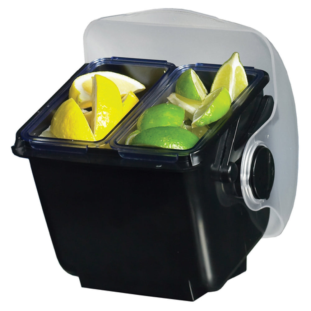 The Carlisle BD2003 San Jamar-Mini Dome Condiment Center is a compact and efficient solution designed to streamline condiment organization in food service environments. Measuring 7-1/2"L x 8-1/4"W x 9-1/2"H, this unit stands out with its practical dimensions that conveniently fit into various kitchen setups. It features the capacity to hold two 1-pint standard trays, making it ideal for establishments looking to maintain an organized and clutter-free condiment station. The inclusion of two end caps and one connector ensures that the trays are securely held in place, enhancing the stability and functionality of the unit. The semi-transparent polycarbonate domed cover offers both visibility and protection, allowing staff to quickly identify contents while keeping them fresh and uncontaminated. Complementing the clear cover is a durable black polycarbonate base that provides a sturdy foundation, ensuring longevity and resilience in busy settings. Certified by NSF, the Carlisle BD2003 San Jamar-Mini Dome Condiment Center meets stringent public health and safety standards, making it a reliable choice for restaurants, cafeterias, and catering services seeking to optimize their condiment storage and presentation. Its thoughtful design and quality materials cater to diverse market needs, emphasizing both practicality and durability.