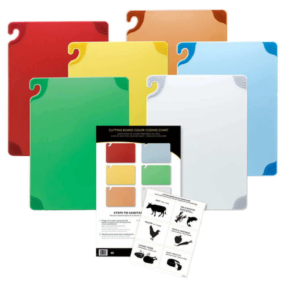 The Carlisle CBG182412RD San Jamar Saf-T-Grip® Cutting Board is a robust kitchen tool designed for precision and safety in culinary environments. This cutting board measures 18 inches by 24 inches, with a thickness of 1/2 inch, making it a substantial surface for various food preparation tasks. Its defining feature is the anti-slip grip corners, which ensure stability and safety during use, significantly reducing the risk of accidents in bustling kitchens. The integrated food safety hook is an innovative addition, promoting hygiene by allowing the board to be stored without contact with other surfaces, thereby preventing cross-contamination. Additionally, the cutting board incorporates an integrated ruler, a practical feature that aids chefs in achieving precise cuts and measurements. Constructed from durable co-polymer, this board is both resilient and dishwasher safe, ensuring it withstands the rigors of daily use while maintaining ease of cleaning. The vibrant red color not only adds a splash of color to the kitchen but also aids in color-coded food preparation systems, enhancing food safety protocols. Certified by NSF, this cutting board meets high standards of public health protection, making it an ideal choice for professional kitchens prioritizing safety and precision.