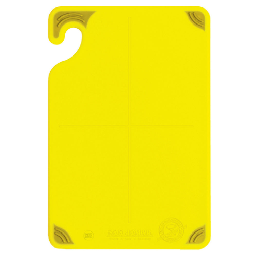 The Carlisle CBG6938YL San Jamar Saf-T-Grip® Bar Cutting Board 6" X 9" X 3/8" is meticulously engineered to cater to the specific needs of food service professionals. This cutting board is crafted from durable co-polymer material, ensuring longevity and resilience in high-demand environments. The anti-slip grip corners provide stability during use, reducing the risk of accidents and enhancing precision in food preparation tasks. An integrated ruler on the board offers an innovative feature for precise measurements, catering to chefs and bartenders who require exact cutting dimensions. The inclusion of a food safety hook allows for safe and hygienic storage, aligning with best practices in food safety protocols. The board is dishwasher safe, simplifying the cleaning process and maintaining hygiene standards effortlessly. Its vibrant yellow color not only adds a splash of brightness to any kitchen or bar setting but also aids in color-coded food safety systems, helping to prevent cross-contamination. Certified by NSF, this product meets the rigorous standards for public health protection. The compact dimensions of 6" x 9" x 3/8" make it an ideal choice for bar settings where space is a premium, offering unparalleled practicality and efficiency.