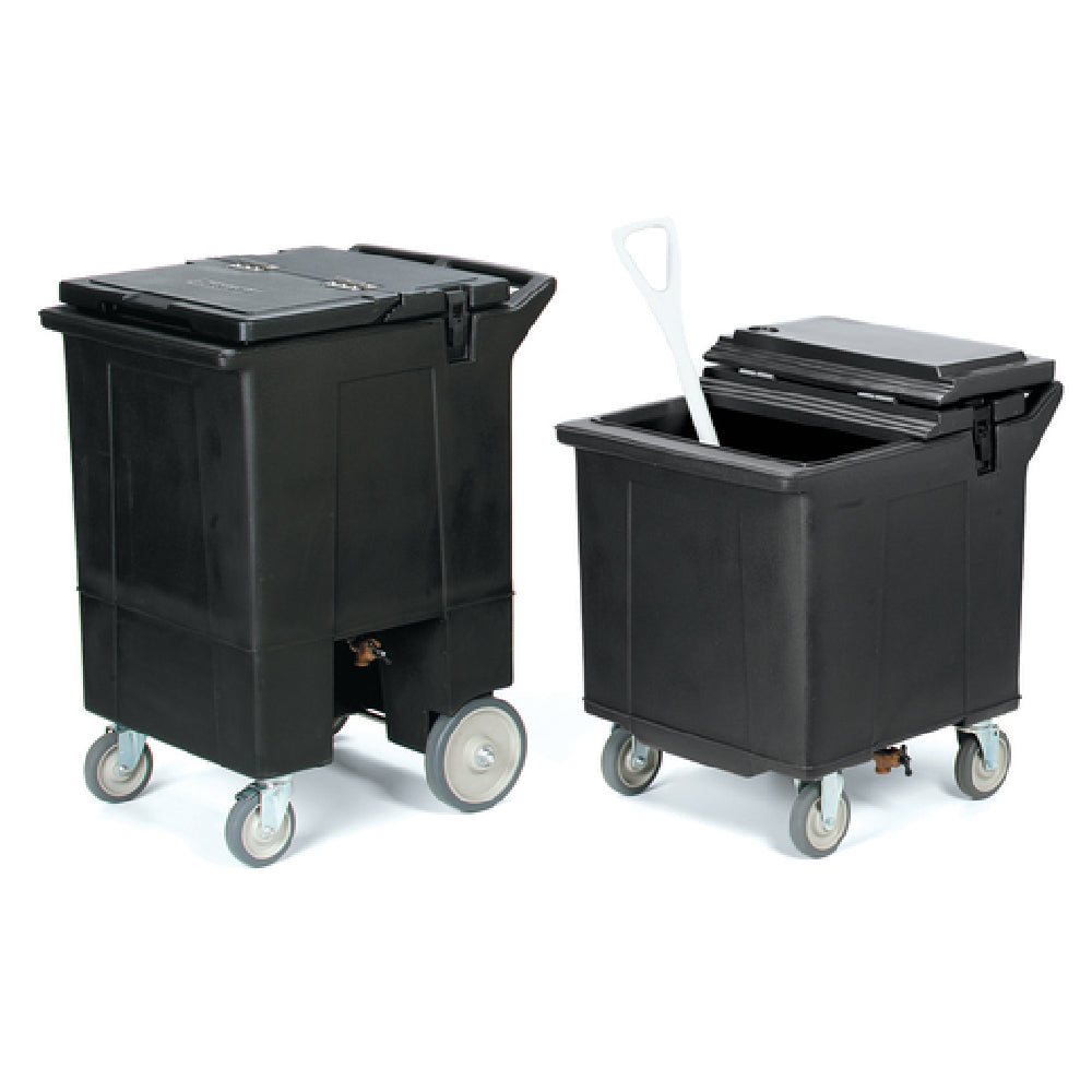 The Carlisle IC225003 Carlisle Cateraide™ Mobile Ice Caddy 125 lb. Capacity is an innovative solution designed to enhance efficiency and convenience for catering services and food service operations. This mobile ice caddy is engineered with a capacity to hold up to 125 lbs of ice, ensuring ample supply for various service needs. It boasts an insulated construction, maintaining optimal ice temperature and reducing melting rates. The removable lid is reinforced with stainless steel hinges, providing durability and ease of use. Nylex™ latches ensure secure closure, while a front drainage faucet allows for quick and easy water disposal. The caddy also features a convenient shelf and a sloped inside base for efficient ice handling and storage. Dual handles enhance maneuverability, and the unit's stain and scratch-resistant polyethylene construction ensures longevity. It is equipped with two 5-inch rigid casters and two 5-inch swivel casters, one with a brake, offering stability and mobility. The Carlisle IC225003 is NSF certified, signifying its compliance with safety and public health standards. Made in the USA, this mobile ice caddy represents a blend of functionality and quality, making it an essential asset for any establishment requiring reliable ice storage and transport solutions.