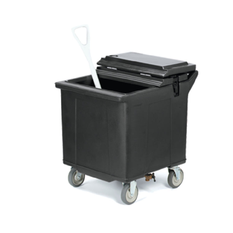 The Carlisle IC225403 Carlisle Cateraide™ Mobile Ice Caddy is a versatile and robust solution designed to meet the diverse needs of the food service industry. With a capacity of 125 lbs, this caddy is insulated to ensure optimal ice preservation. The removable lid is reinforced with stainless steel hinges, enhancing durability and ease of use. Featuring Nylex™ latches, the caddy provides secure closure, while the front drainage faucet facilitates efficient water management. A convenient shelf is incorporated for additional utility, and the sloped inside base aids in the collection and drainage of melted ice. Dual handles ensure easy maneuverability, complemented by four 5-inch swivel casters, one equipped with a brake for added stability. Constructed from stain and scratch-resistant polyethylene, this mobile ice caddy is both resilient and easy to maintain. Its black finish offers a sleek, professional appearance, making it suitable for various hospitality settings. Proudly made in the USA, this ice caddy is NSF certified, underscoring its adherence to public health and safety standards. Ideal for catering services, event venues, and restaurants, the Carlisle Cateraide™ Mobile Ice Caddy seamlessly combines functionality and durability, making it an indispensable asset in any professional kitchen or event setting.