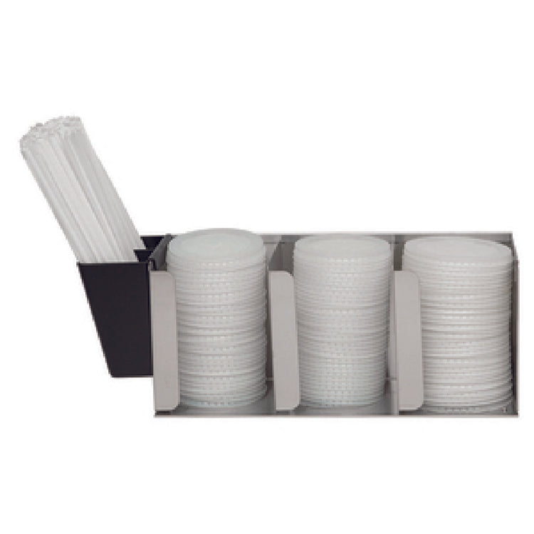 The Carlisle L1014 San Jamar Lid Organizer is a meticulously designed product tailored for efficiency and space optimization in various service environments. Measuring 17-1/8"L x 5-1/8"W x 6-1/2"H, this lid organizer is crafted from 22-gauge 304 stainless steel, ensuring durability and long-lasting use. Its standout feature includes adjustable dividers that separate the organizer into three distinct lid compartments, allowing for customized storage solutions to accommodate different lid sizes and types. The inclusion of anti-slip feet ensures stability on countertops, preventing unwanted movement during use. Additionally, the organizer offers versatile installation options - it can be mounted either to a wall or a beverage dispenser, providing flexible placement in any setting. This makes the Carlisle L1014 an invaluable asset for fast-paced food service operations, including cafes, convenience stores, and restaurants, where organized and efficient access to lids is crucial. The robust construction and versatile application of this lid organizer cater to the diverse needs of industry professionals seeking reliability and functionality in their service setups.