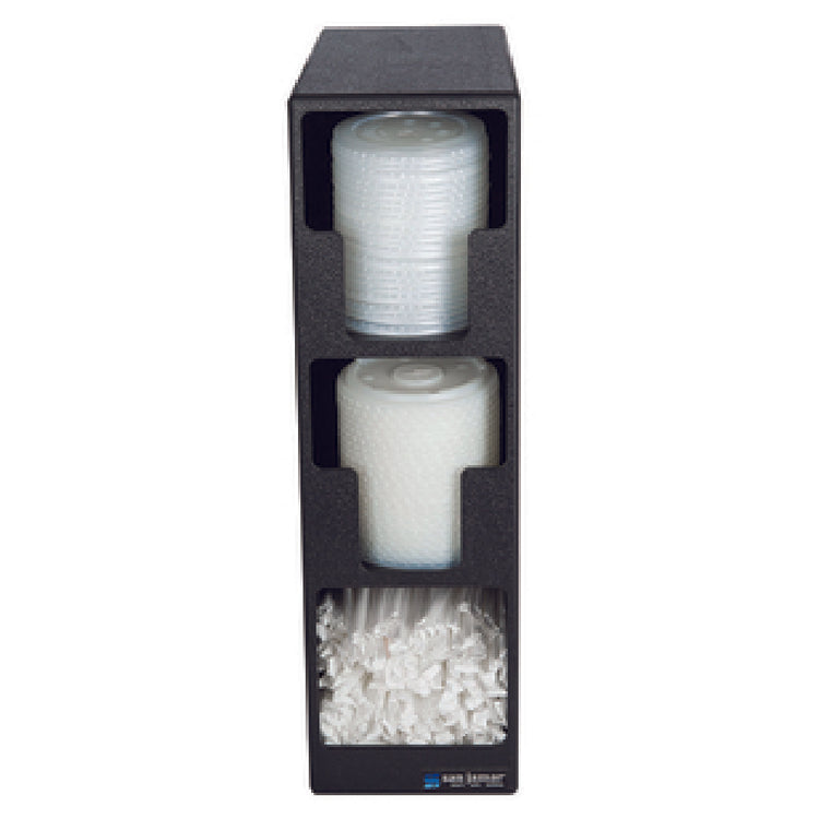 The Carlisle L2202 San Jamar EZ-Fit® Lid & Straw Tower is a practical and efficient countertop accessory designed to streamline beverage service operations. Measuring 5-1/2"L x 13"W x 18-3/4"H, this tower presents a compact yet effective solution for organizing lids and straws. Manufactured by CFS Brands, it integrates two separate lid compartments alongside a singular straw compartment, neatly accommodating the essentials for quick service environments. Constructed from durable polystyrene, its black finish complements a variety of settings while ensuring longevity and resistance to wear. This product is NSF certified, highlighting its adherence to stringent health and safety standards. The Carlisle L2202 is ideal for a range of market segments—from bustling coffee shops and quick-service restaurants to self-service stations in cafeterias—providing a tidy and accessible storage unit that enhances operational efficiency. Its thoughtful design allows for easy access and restocking, catering to environments where both speed and organization are paramount. The San Jamar EZ-Fit® Lid & Straw Tower not only maximizes space but also supports high-volume service demands, making it an invaluable asset in maintaining a well-organized countertop setup. Its technical specifications and sophisticated design cater to the needs of various professional settings within the food service industry.