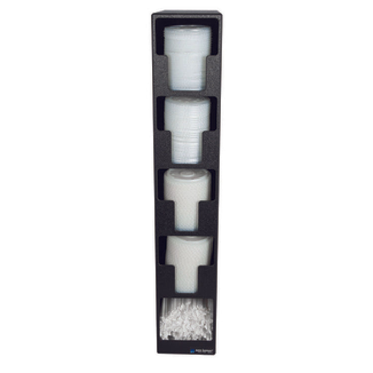The Carlisle L2204 San Jamar EZ-Fit® Lid & Straw Tower is a meticulously designed countertop organizer measuring 5-1/2 inches in length, 13 inches in width, and 30 inches in height. This compact yet functional unit features four lid compartments alongside a dedicated straw compartment, making it an ideal solution for streamlined beverage service in various settings such as cafes, food service establishments, and self-serve stations. Crafted from durable polystyrene, the tower is finished in a sleek black color, complementing a range of interior decors while providing robust and long-lasting performance. Its design not only aids in maintaining an orderly workspace by minimizing clutter but also enhances operational efficiency by ensuring easy access to essential beverage accessories. With its NSF certification, this lid and straw tower adheres to the rigorous standards of public health and safety, making it a reliable choice for establishments prioritizing hygiene and quality. The Carlisle L2204 San Jamar EZ-Fit® Lid & Straw Tower is a versatile asset, catering to the organizational demands of different market segments within the food service industry.