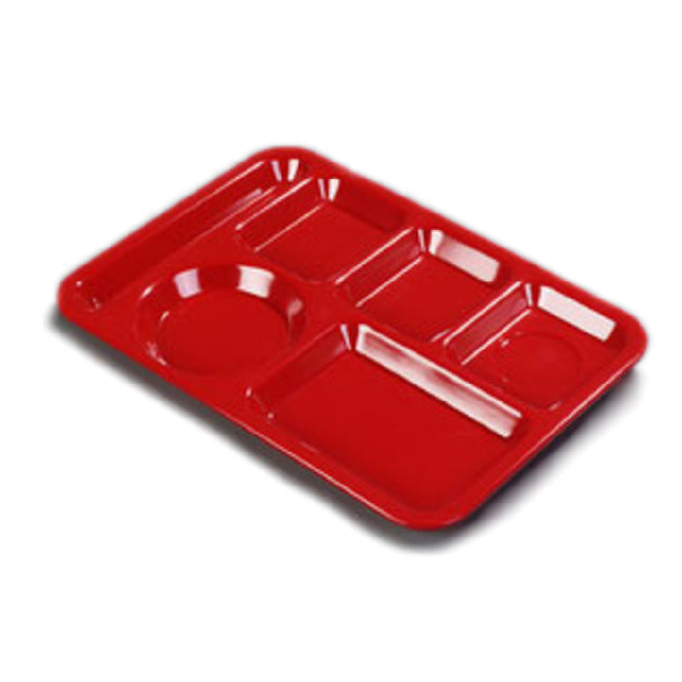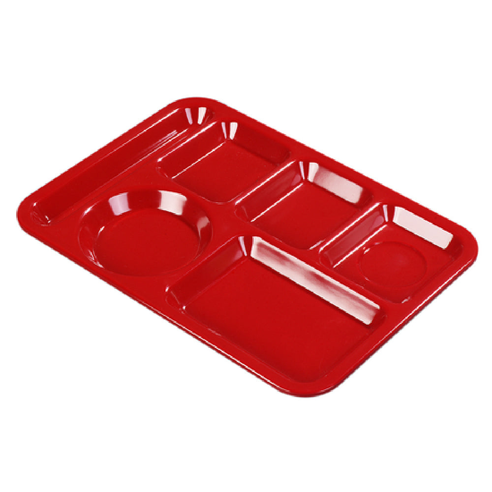 The Carlisle P61405 Carlisle Compartment Tray, measuring 13-7/8 inches in length and 10 inches in width, is a specialized dining solution designed for left-handed users in various food service settings. This rectangular tray is thoughtfully segmented into six compartments, catering to diverse meal components with precision: three small upper compartments, two large lower compartments, and one dedicated flatware compartment. Crafted from durable polypropylene, the tray is engineered to resist stains, scratches, and breaks, ensuring longevity in demanding environments. Its vibrant red color not only adds aesthetic appeal but also aids in quick identification and sorting in bustling kitchens. Importantly, the tray is dishwasher safe, offering convenience in cleaning and maintenance. Certified by NSF, it adheres to rigorous public health standards, making it a reliable choice for institutional dining facilities, school cafeterias, and healthcare establishments. The Carlisle P61405 tray harmonizes functionality with durability, making it an indispensable tool for efficient meal service.