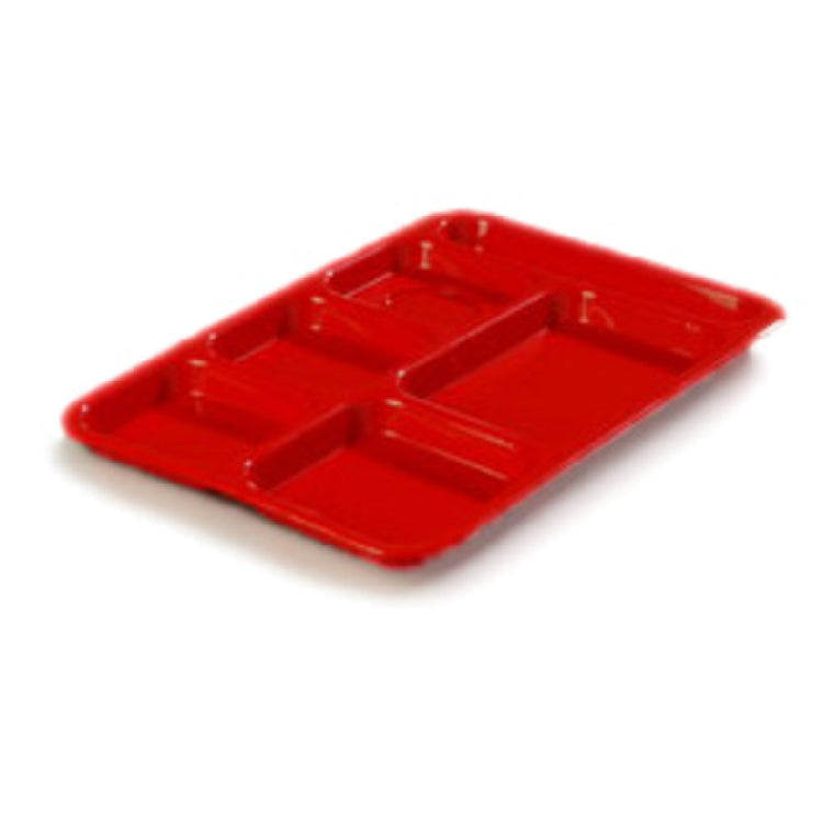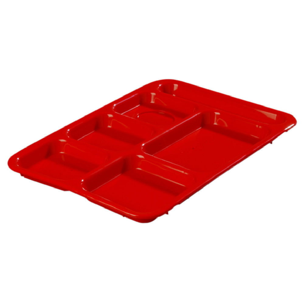 The Carlisle P614R05 Carlisle Compartment Tray 14-3/8"L X 10"W Right-handed is an expertly designed rectangular tray that is particularly suitable for various institutional and food service segments requiring organized meal service solutions. With its precise dimensions of 14-3/8 inches in length and 10 inches in width, this tray offers a strategic layout through its six compartments - three small upper compartments, two large lower compartments, and one flatware compartment - to efficiently accommodate different food items and utensils. Engineered from durable polypropylene, the tray is both chemical resistant and dishwasher safe, ensuring long-lasting use and easy maintenance. The bright red color enhances visibility and aesthetic appeal while also allowing for easy identification in busy environments. Certified by NSF, this compartment tray meets rigorous public health and safety standards, making it reliable for use in institutional settings like schools, hospitals, and cafeterias. The right-handed design caters specifically to the needs of right-handed users, providing an ergonomic benefit that can speed up serving lines and improve user comfort. This product embodies a blend of practical design and robust construction, making it a valuable choice for professionals seeking reliable and efficient meal service solutions.